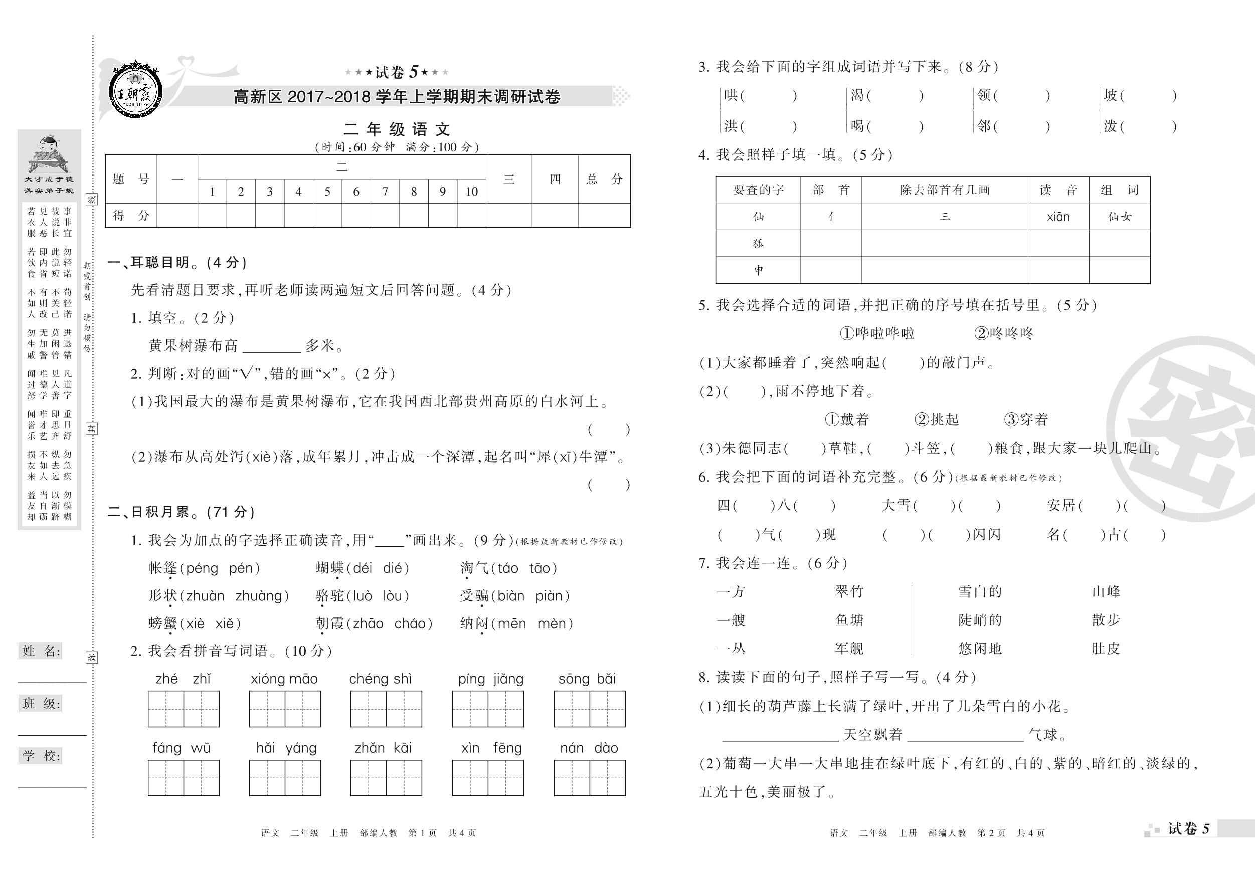 2017-2018学年第一学期郑州市高新区二年级语文试卷(人教版)【5】