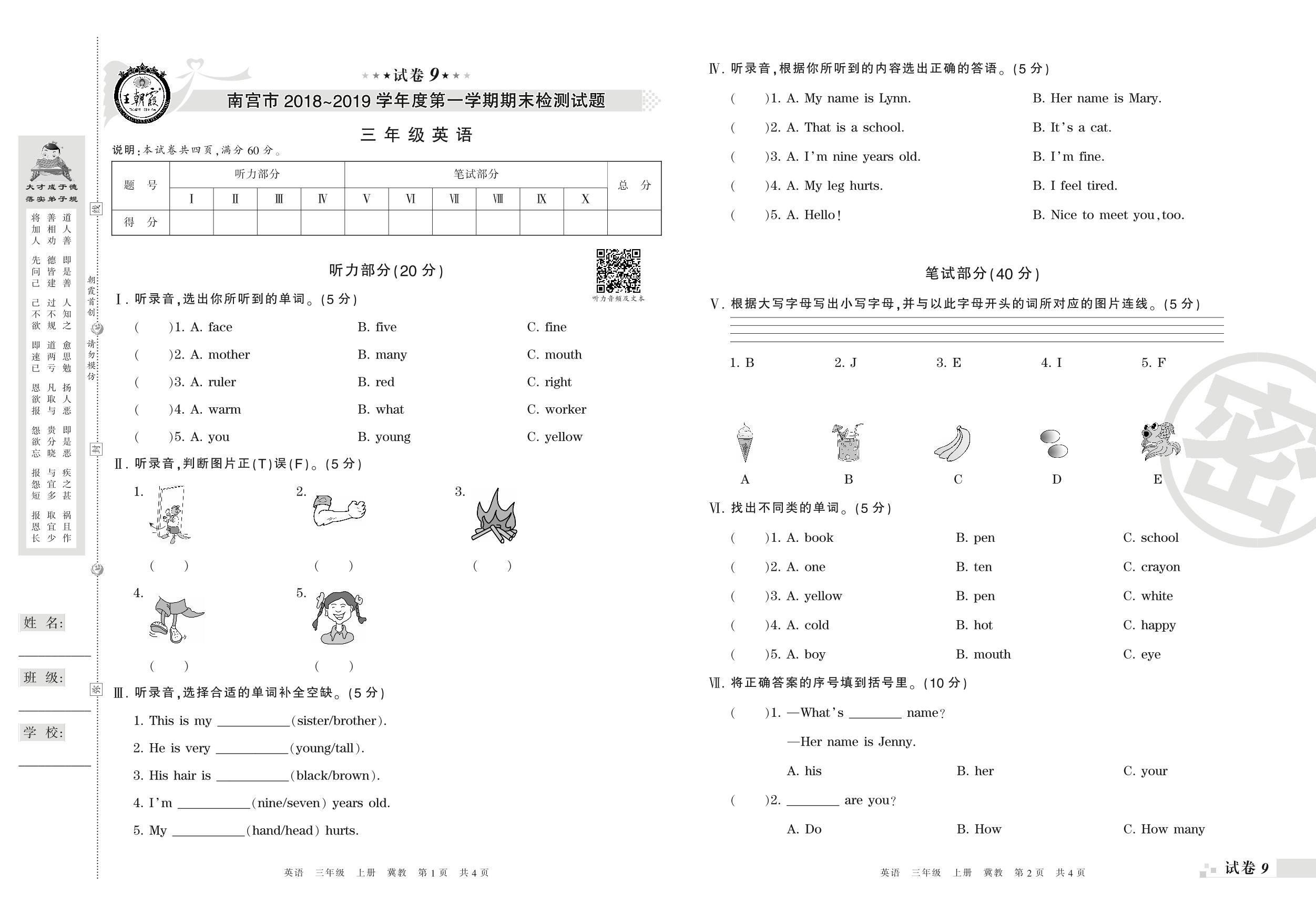 2018-2019学年第一学期南宫市三年级英语试卷(冀教版)【9】