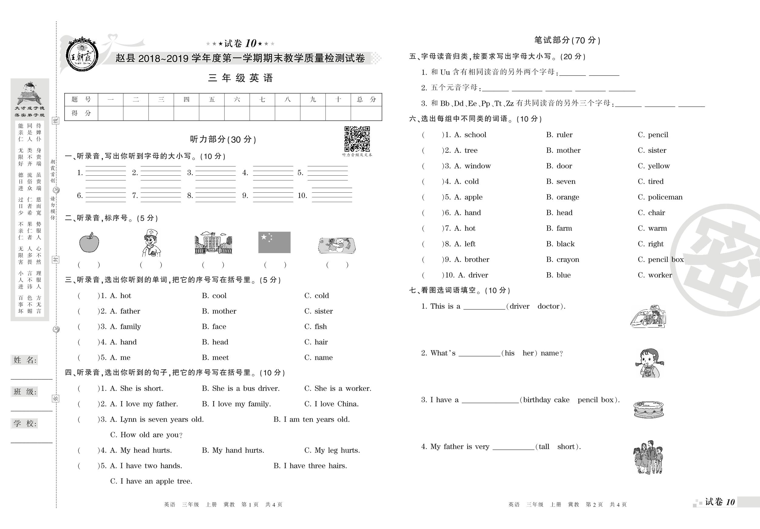 2018-2019学年第一学期石家庄市赵县三年级英语试卷(冀教版)【10】