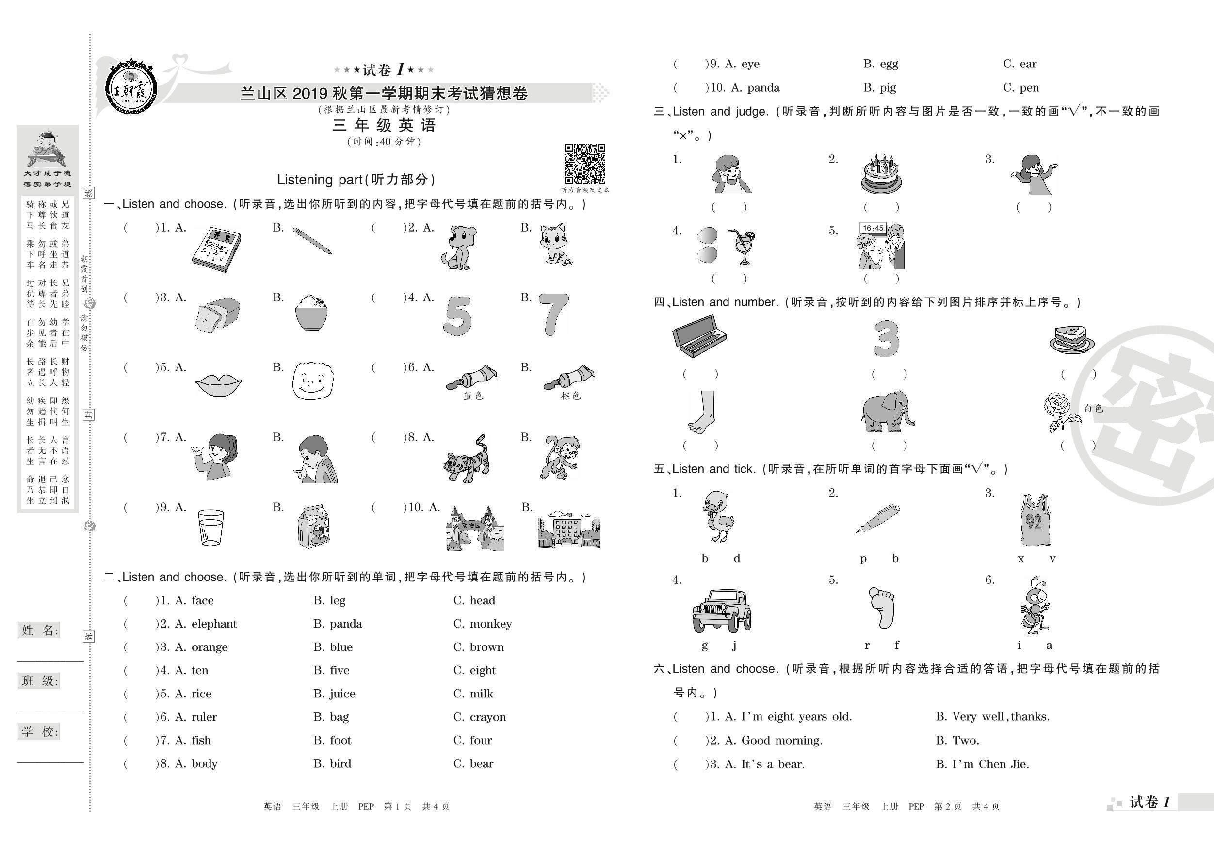 2018-2019学年第一学期临沂市兰山区三年级英语试卷(PEP版)【1】
