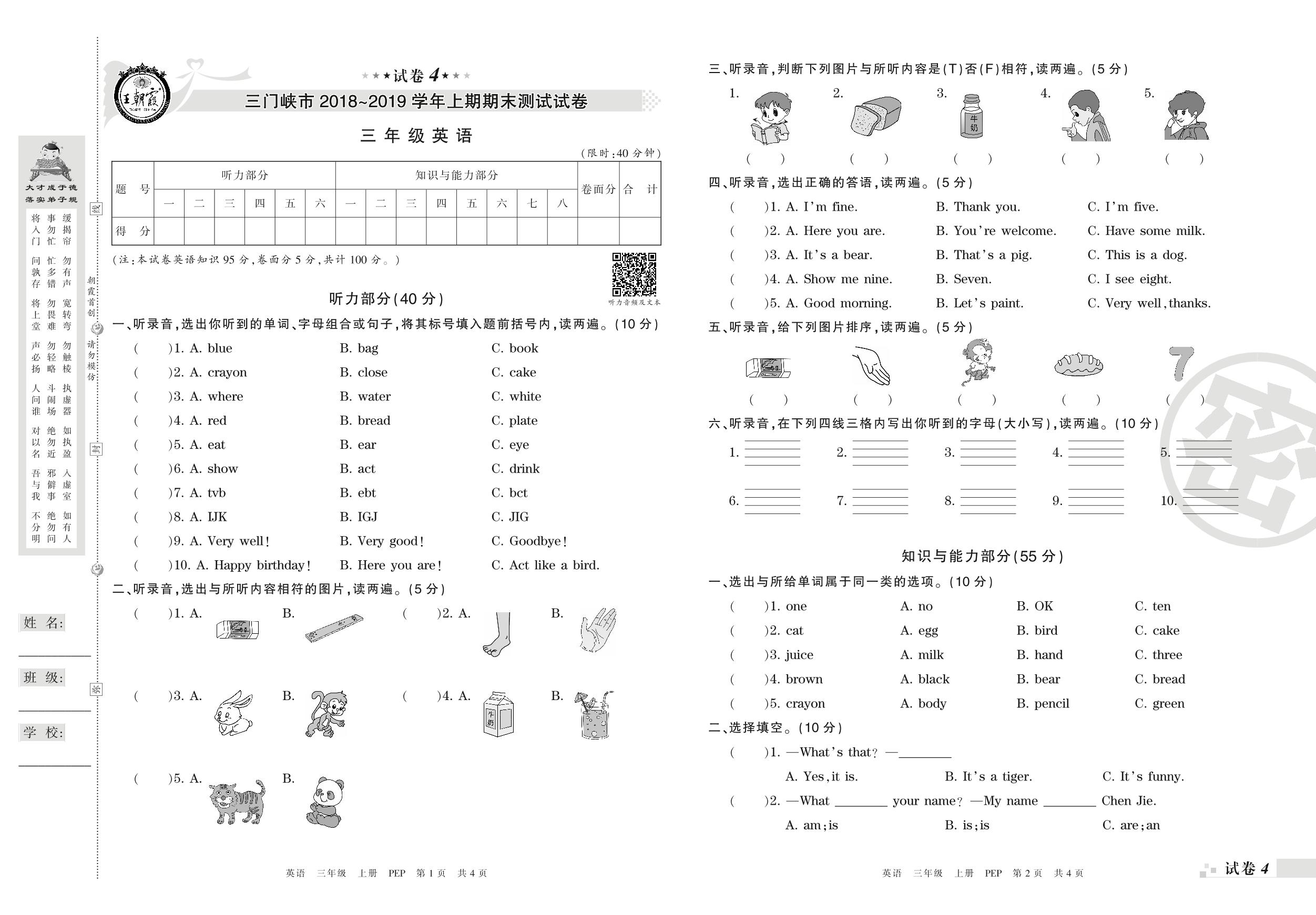 2018-2019学年第一学期三门峡市三年级英语试卷(PEP版)【4】