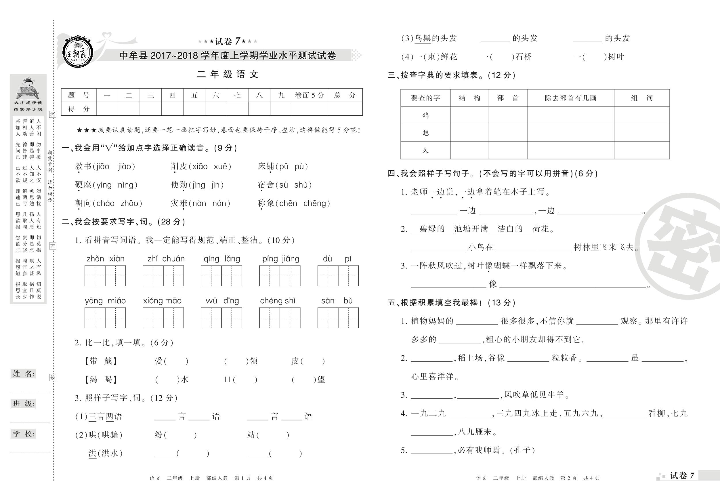 2017-2018学年第一学期郑州市中牟县二年级语文试卷(人教版)【7】