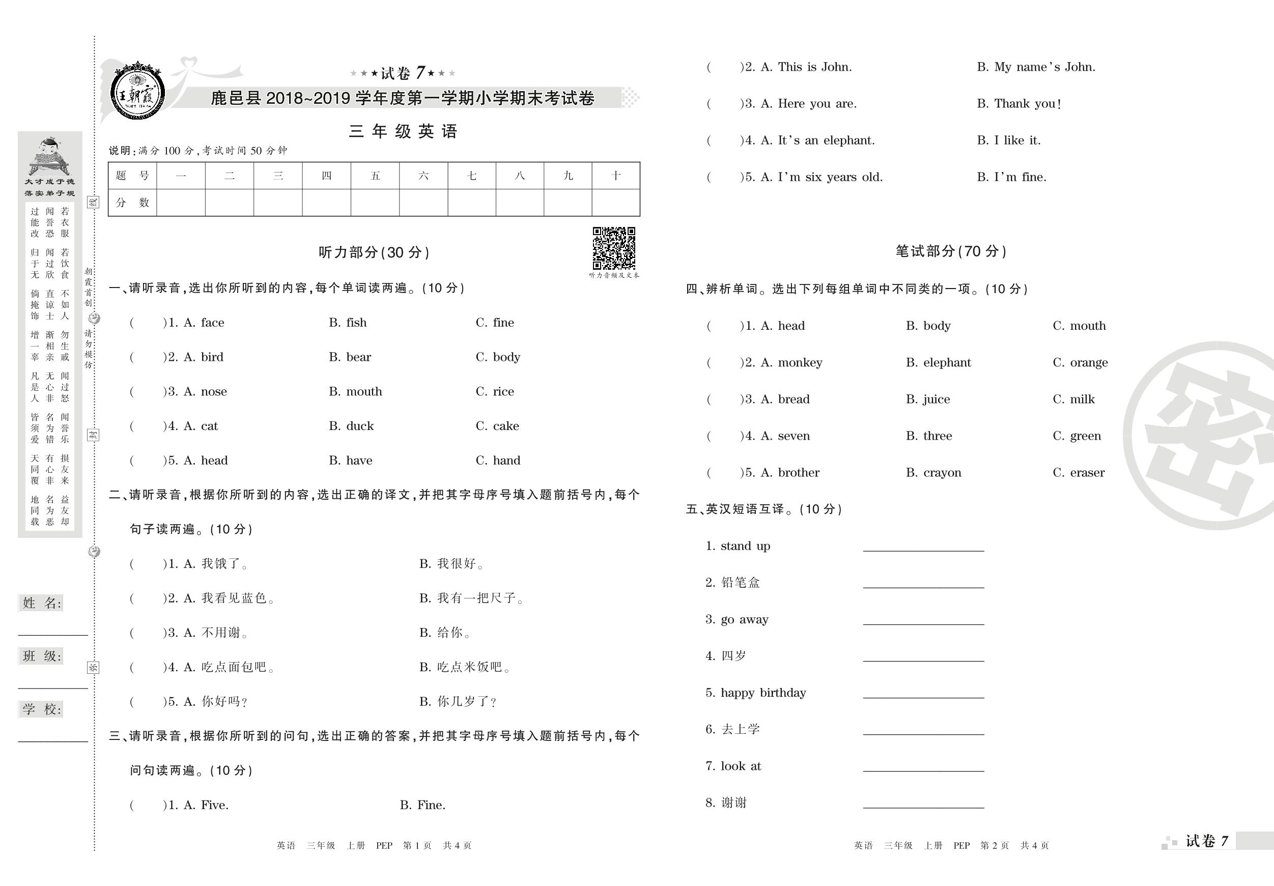 2018-2019学年第一学期周口市鹿邑县三年级英语试卷(PEP版)【7】