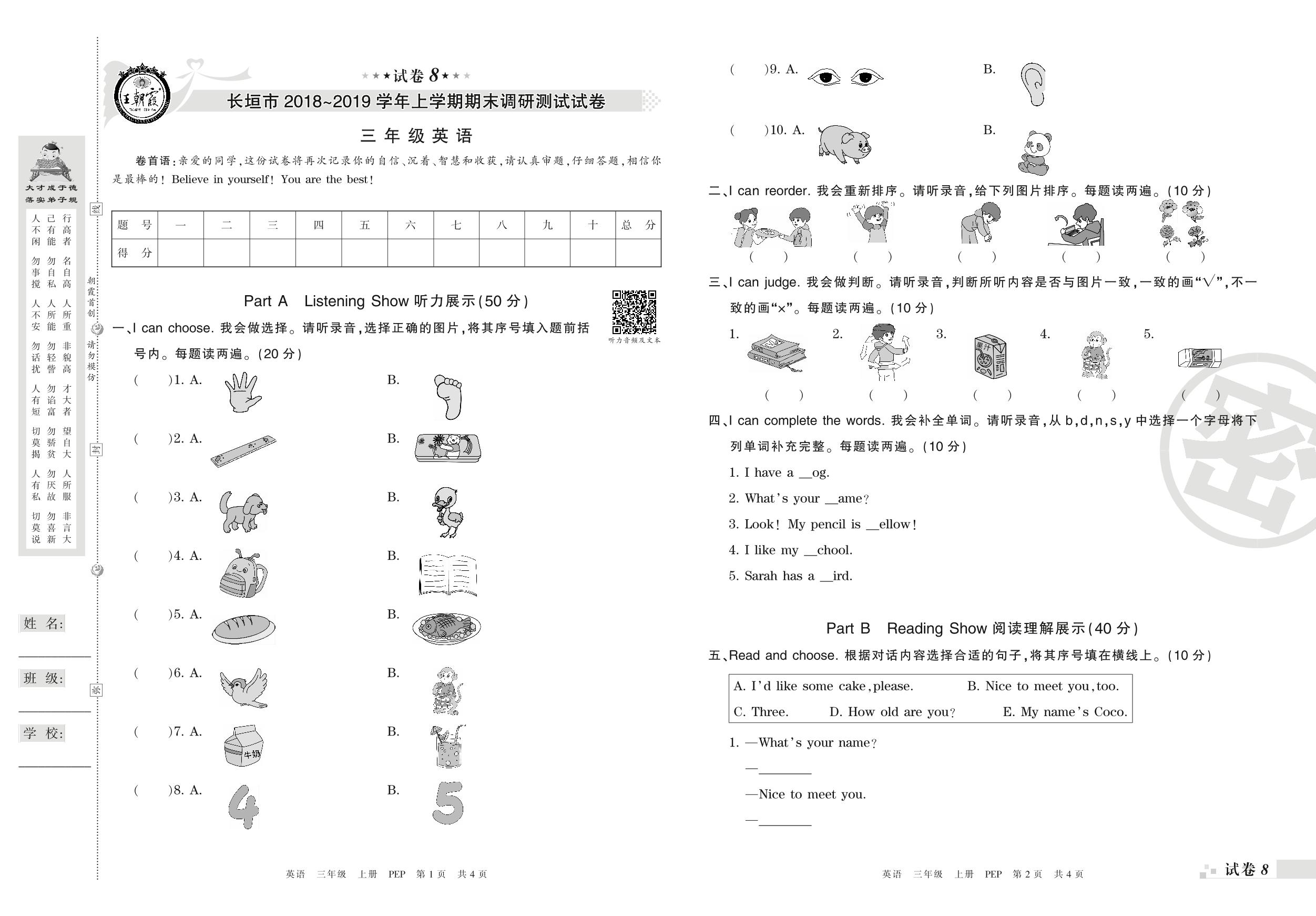 2018-2019学年第一学期长垣市三年级英语试卷(PEP版)【8】