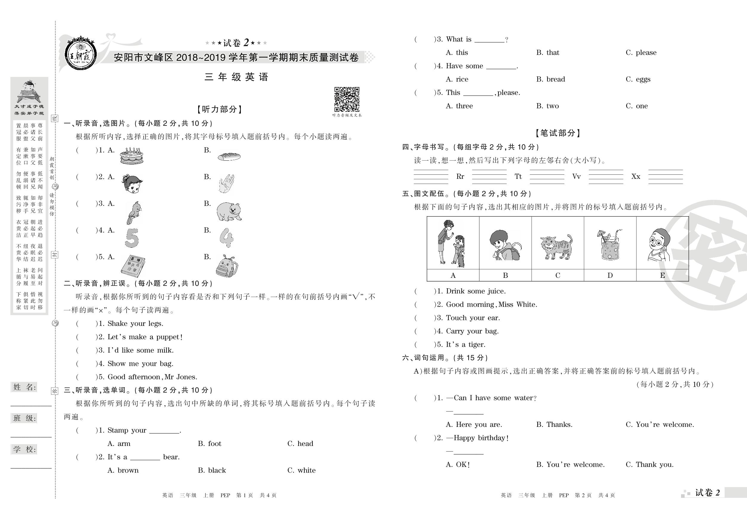2018-2019学年第一学期安阳市文峰区三年级英语试卷(PEP版)【2】