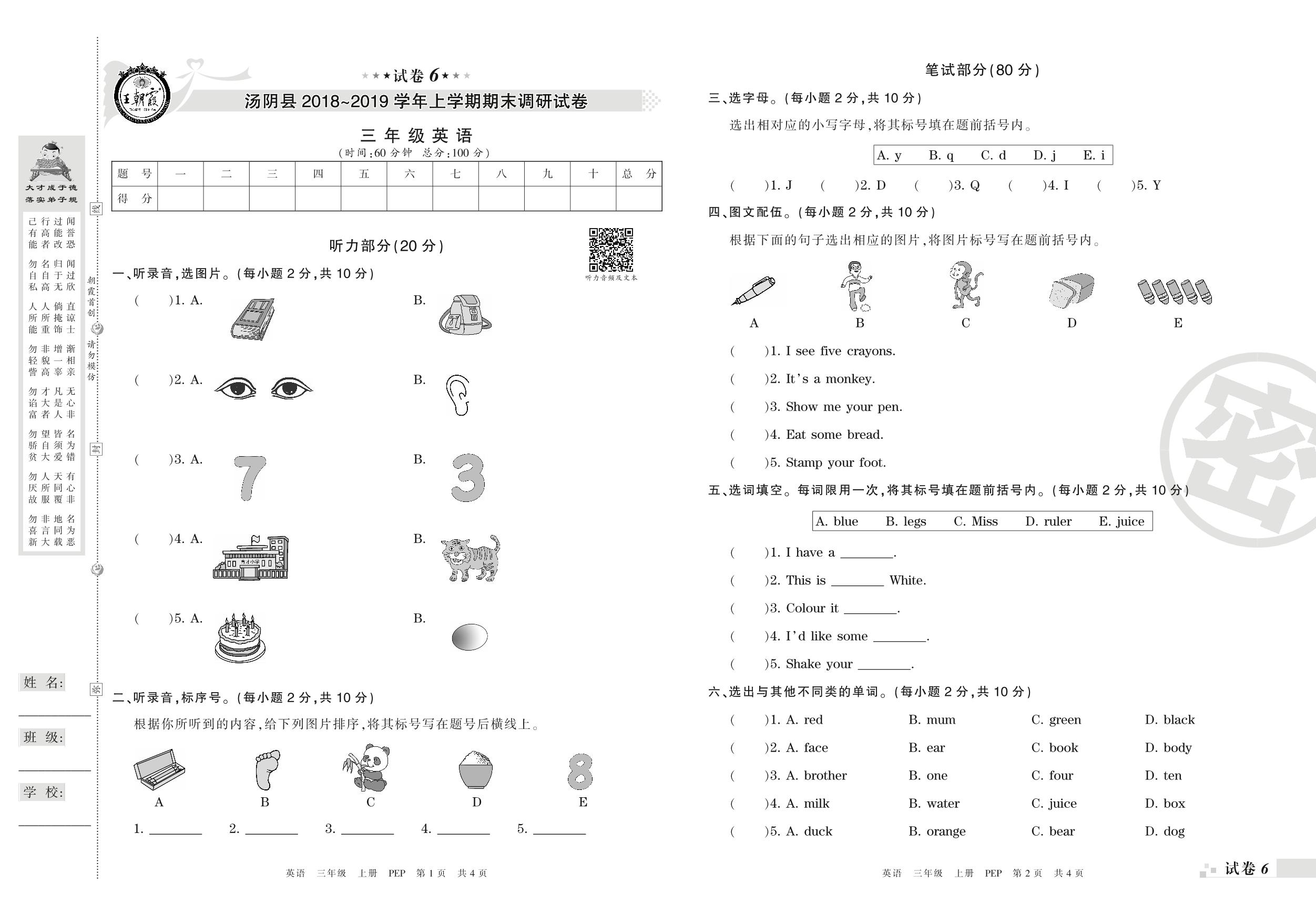 2018-2019学年第一学期安阳市汤阴县三年级英语试卷(PEP版)【6】