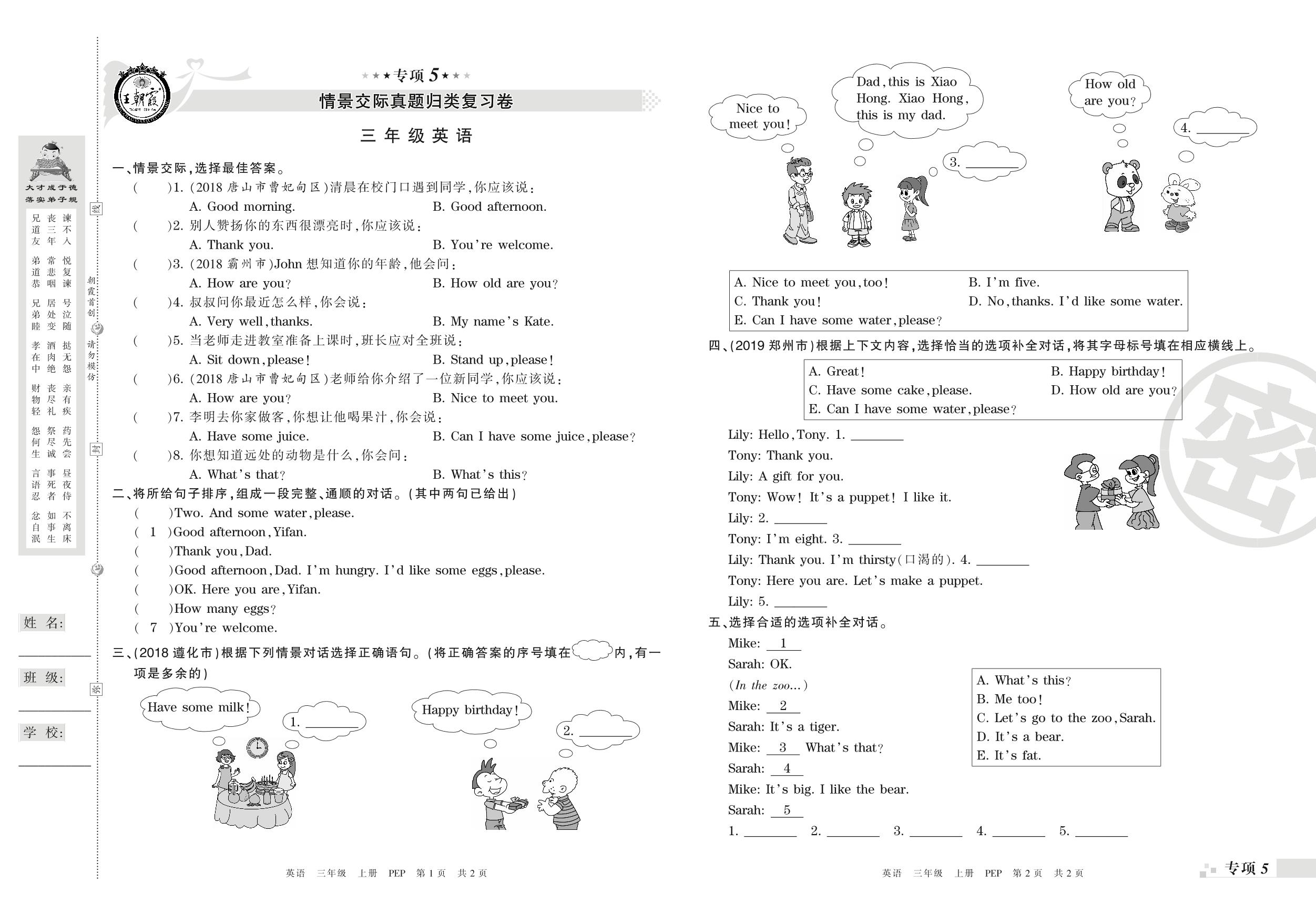 王朝霞期末专项卷——情景交际、阅读理解真题归类复习三年级上册英语(PEP版)_R210806191003【0】