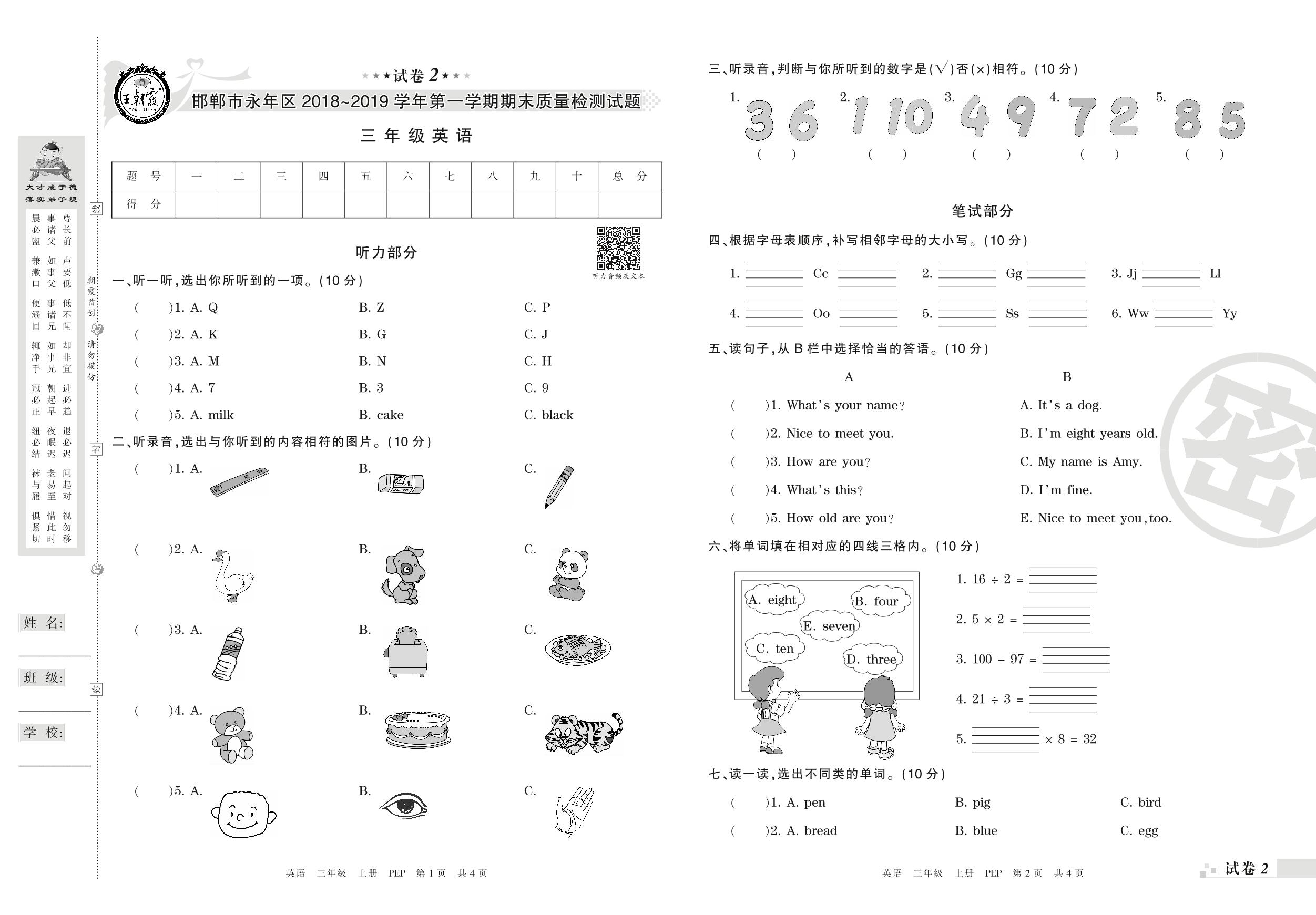 2018-2019学年第一学期邯郸市永年区三年级英语试卷(PEP版)【2】