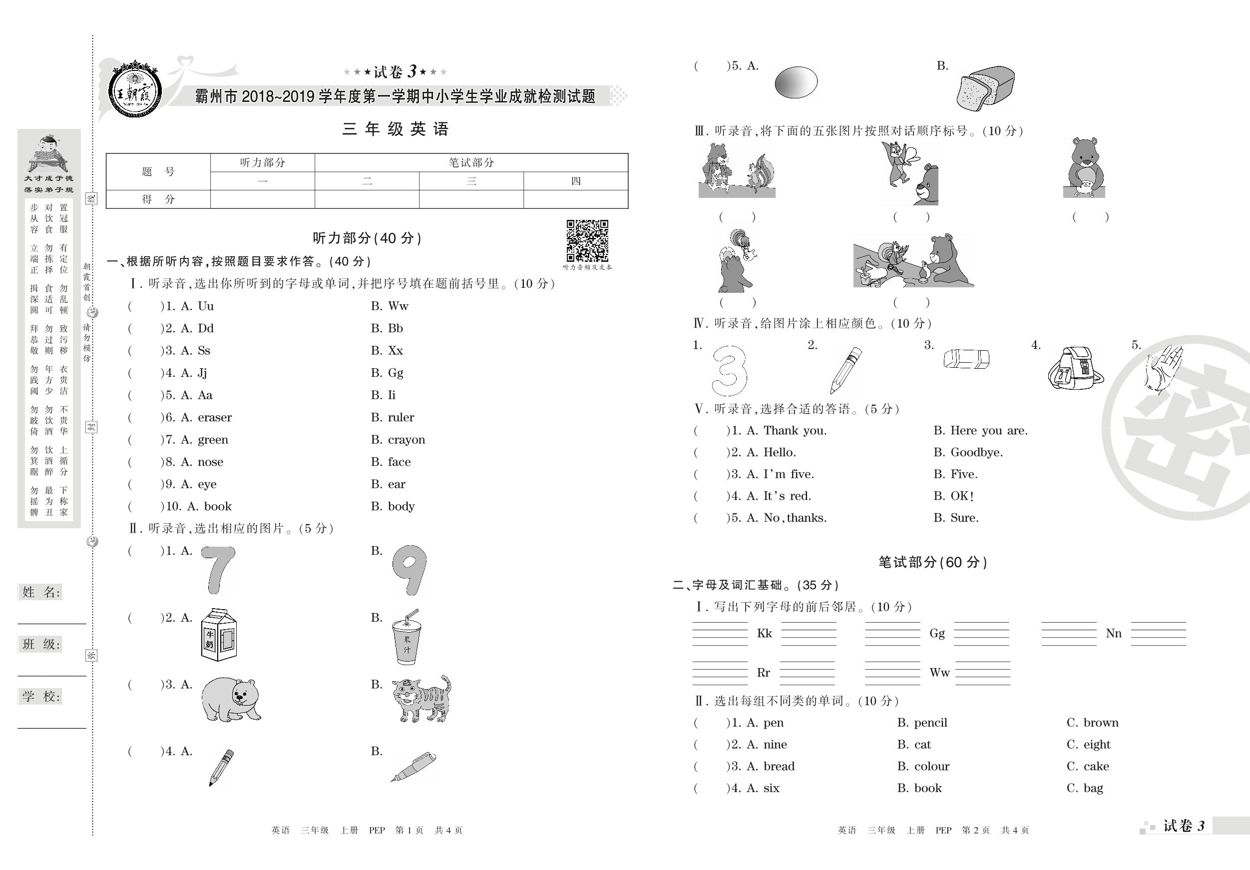 2018-2019学年第一学期霸州市三年级英语试卷(PEP版)【3】