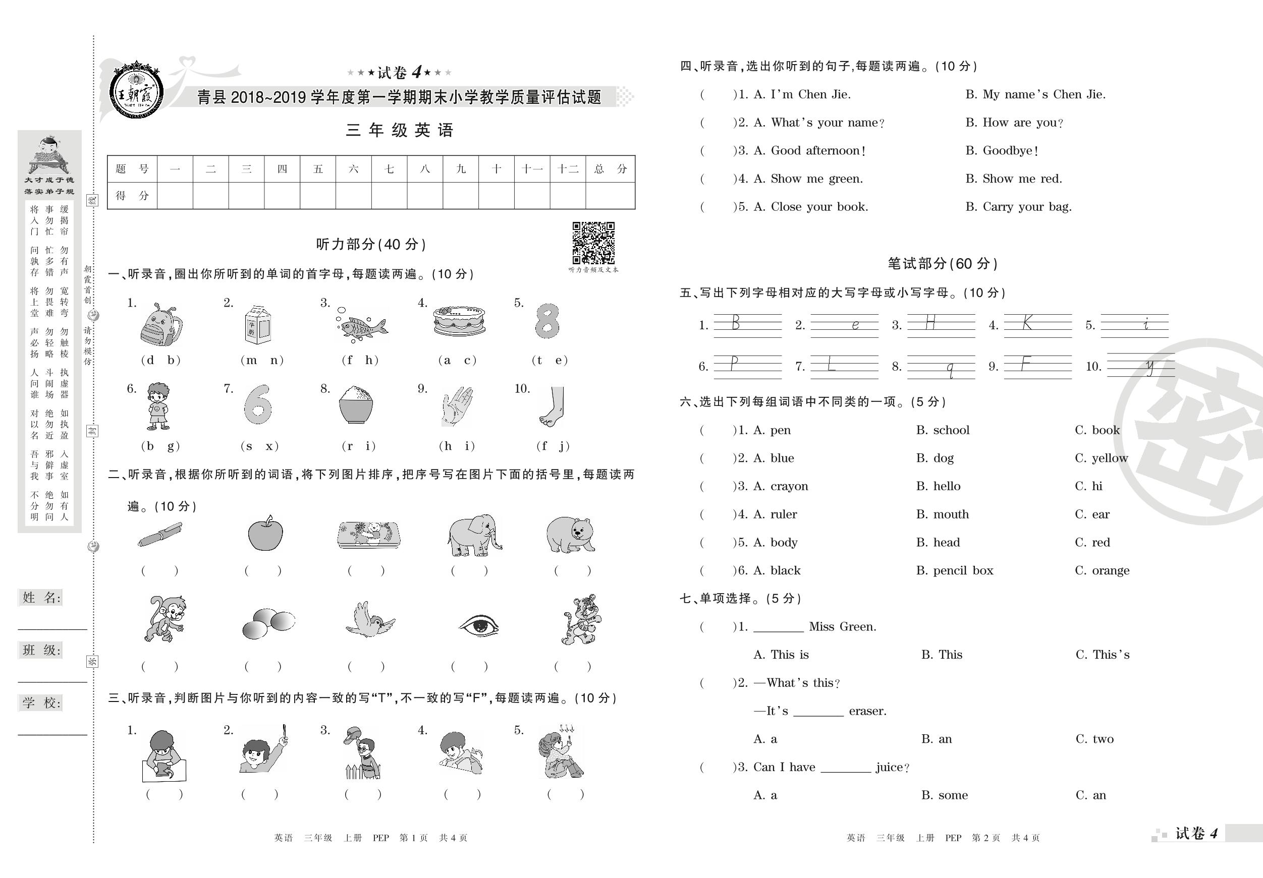 2018-2019学年第一学期沧州市青县三年级英语试卷(PEP版)【4】