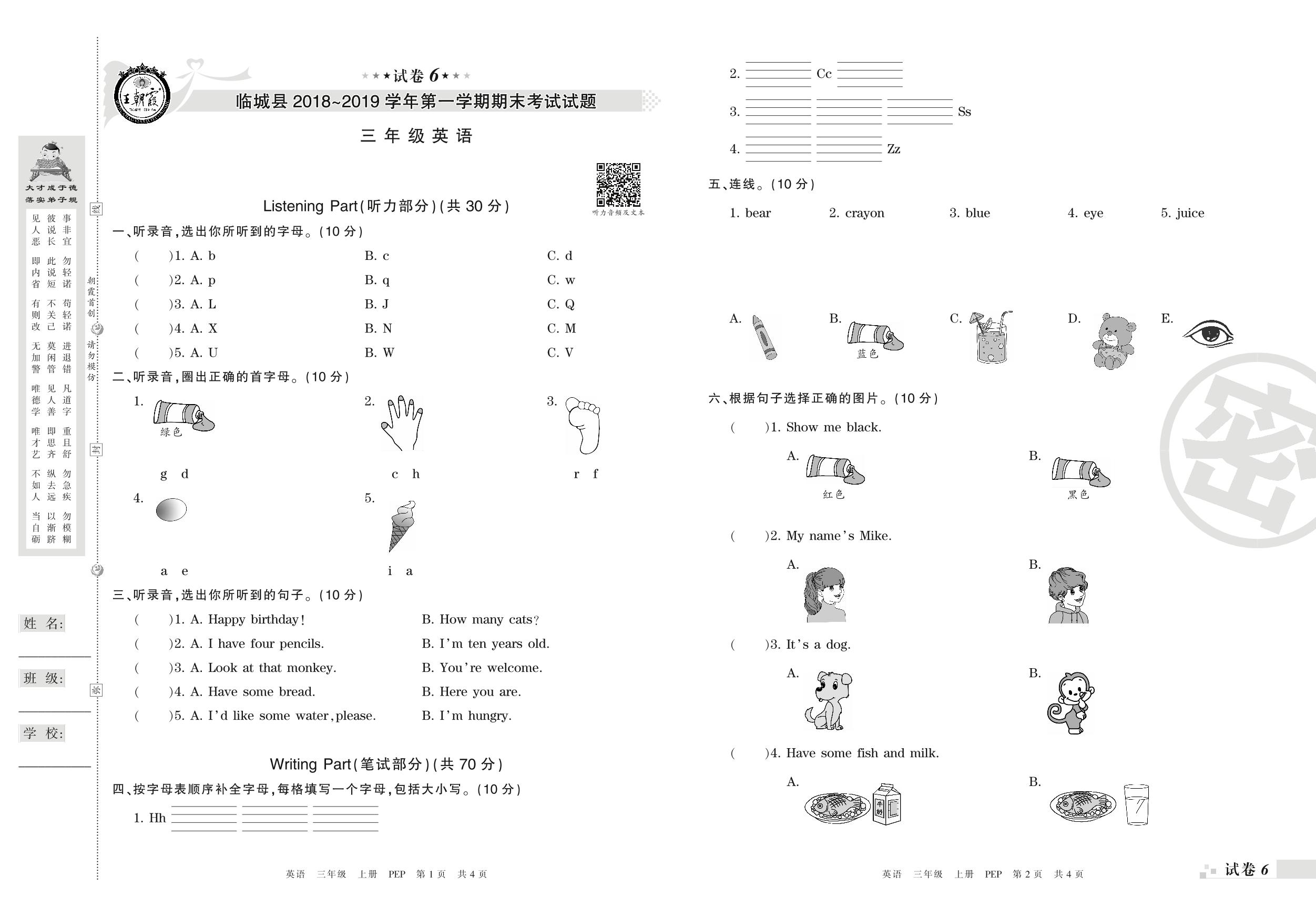 2018-2019学年第一学期邢台市临城县三年级英语试卷(PEP版)【6】