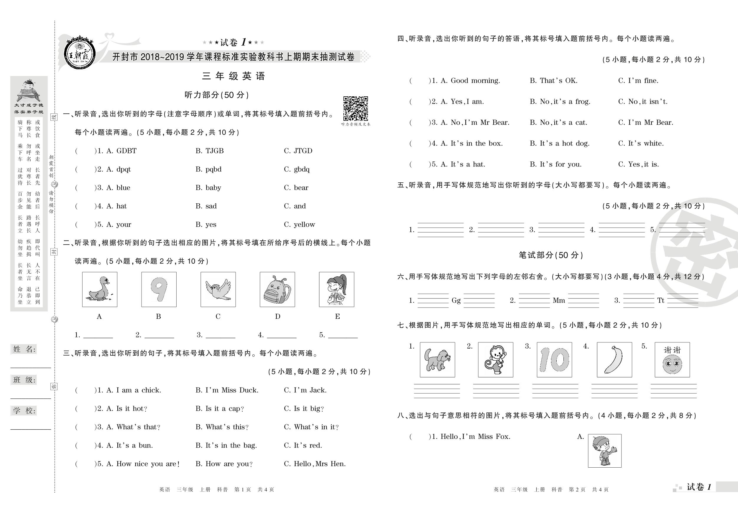 2018-2019学年第一学期开封市三年级英语试卷(科普版)【1】