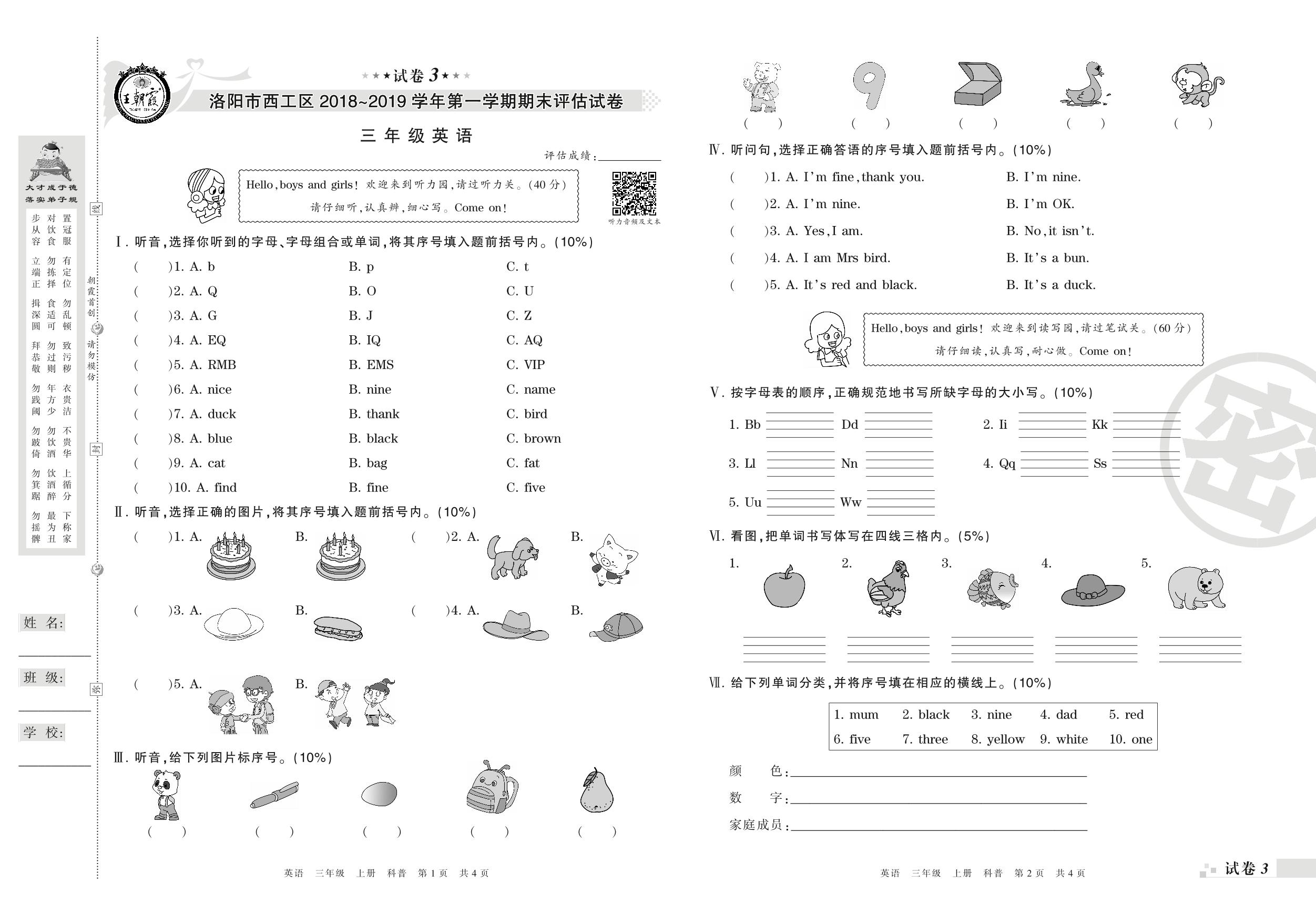2018-2019学年第一学期洛阳市西工区三年级英语试卷(科普版)【3】