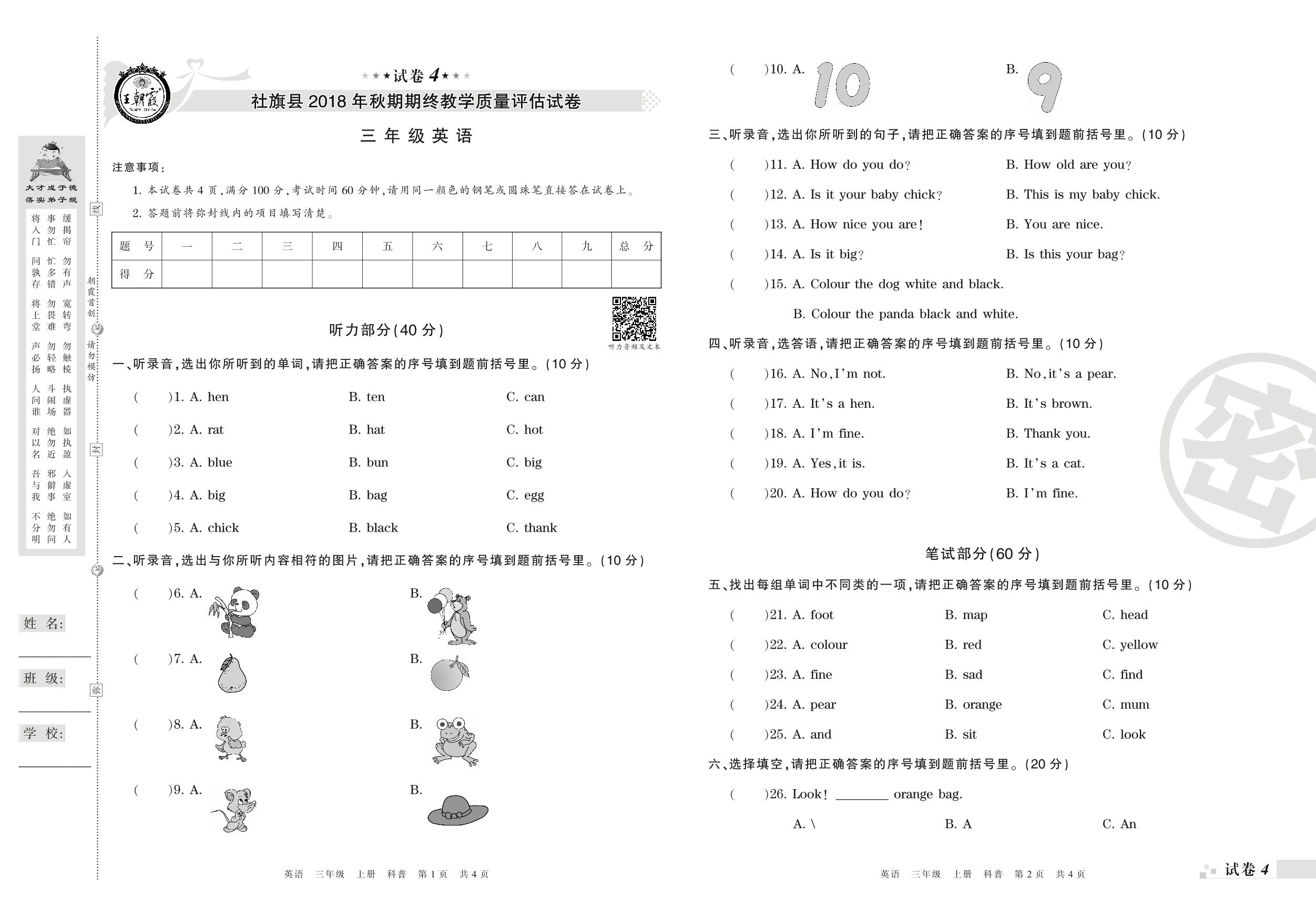 2018-2019学年第一学期南阳市社旗县三年级英语试卷(科普版)【4】