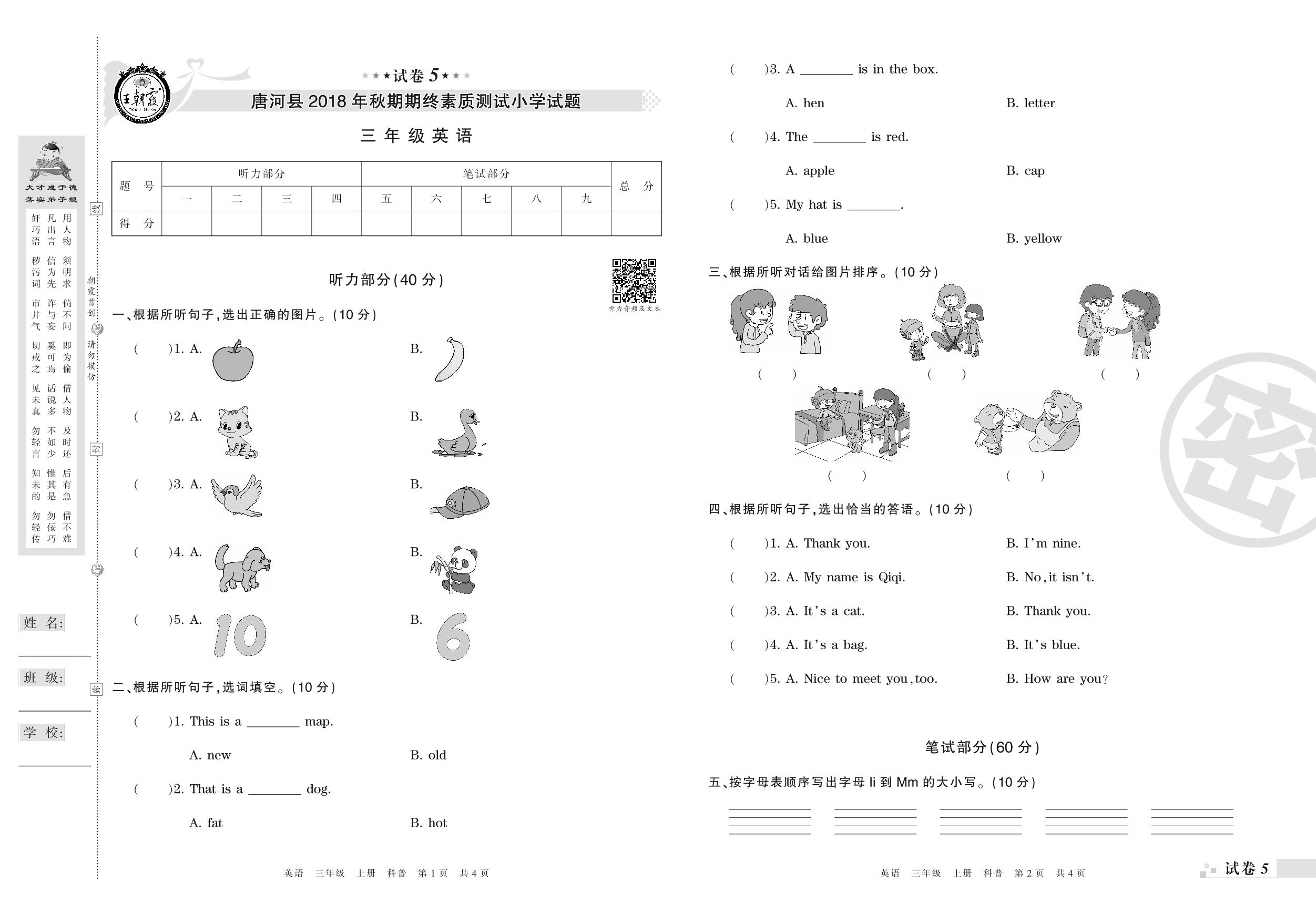 2018-2019学年第一学期南阳市唐河县三年级英语试卷(科普版)【5】
