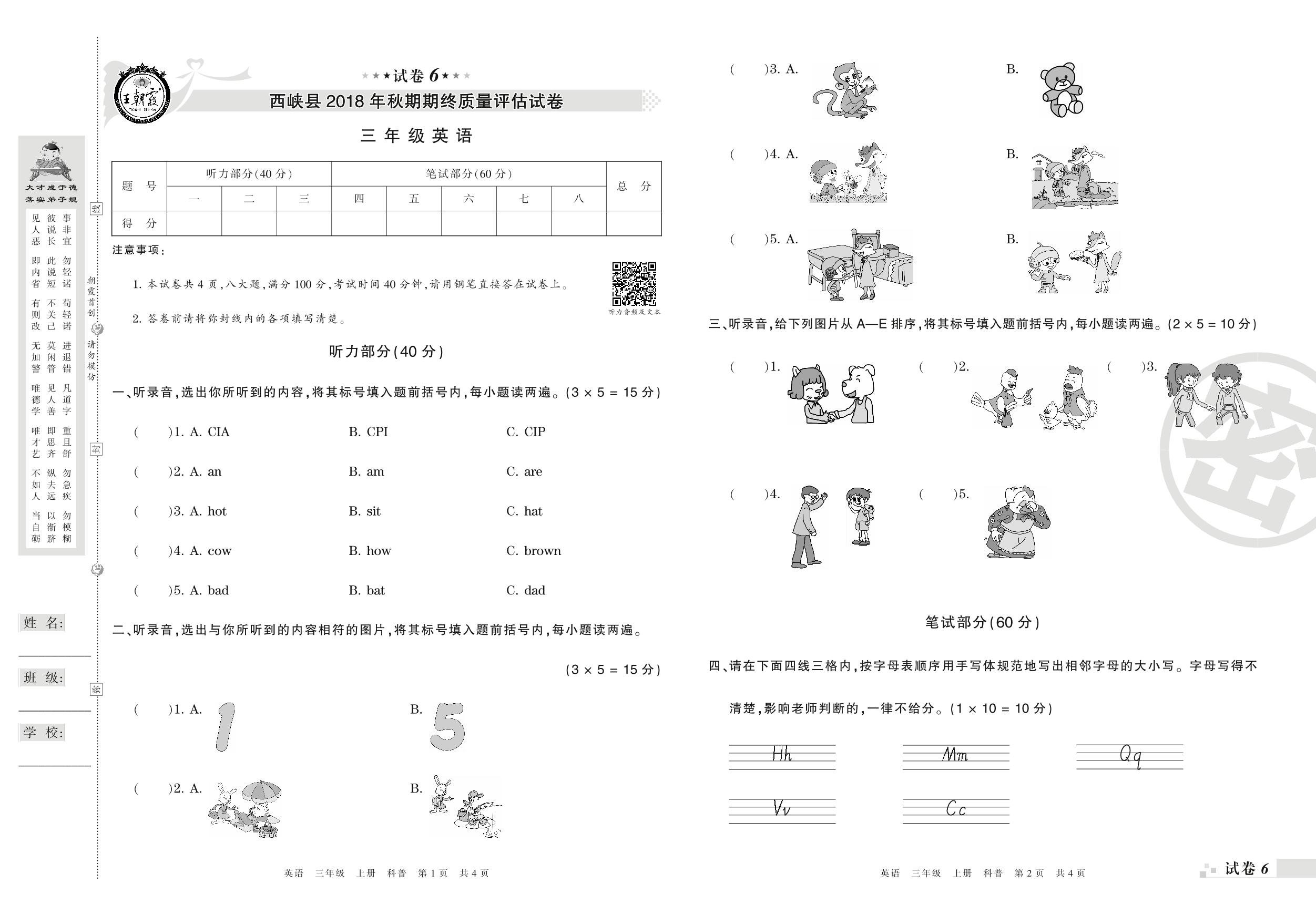 2018-2019学年第一学期南阳市西峡县三年级英语试卷(科普版)【6】