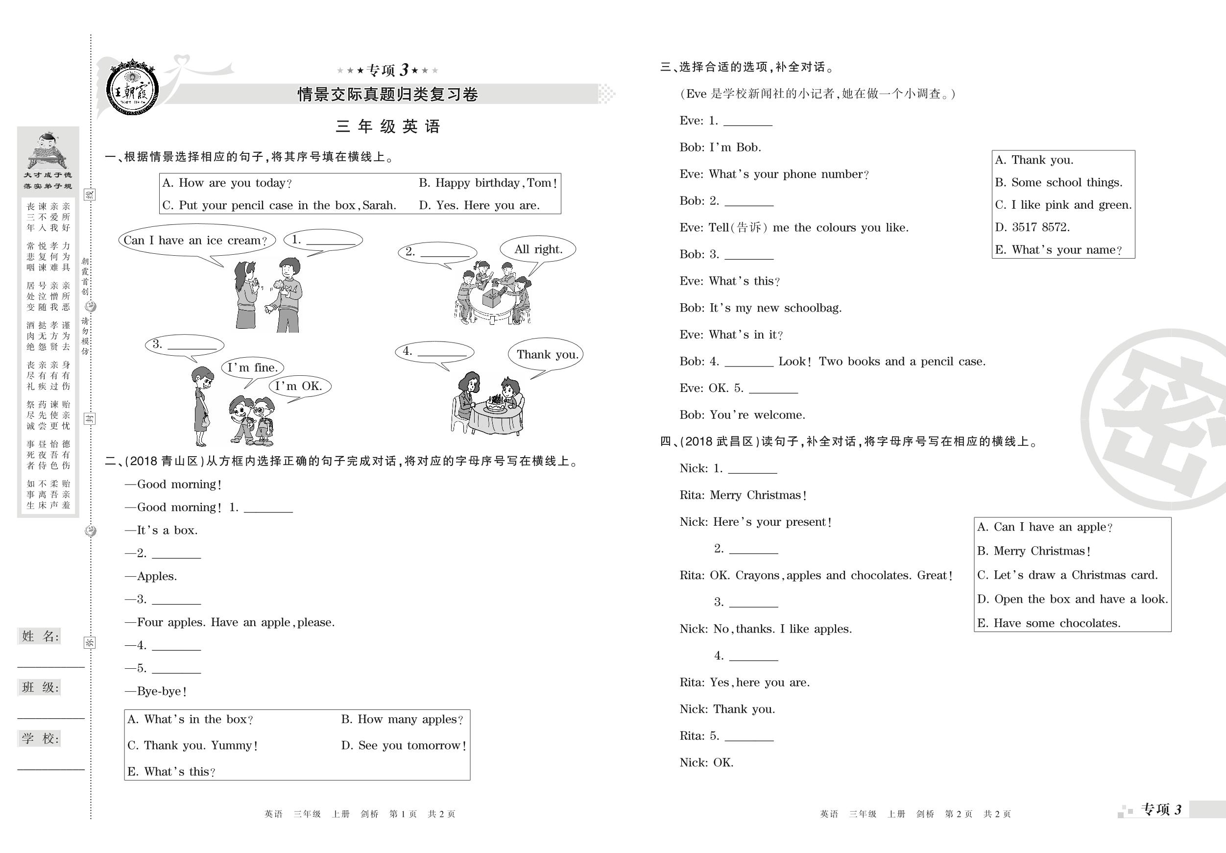 王朝霞期末专项卷——情景交际、阅读理解真题归类复习三年级上册英语(剑桥版)_R210806191203【0】
