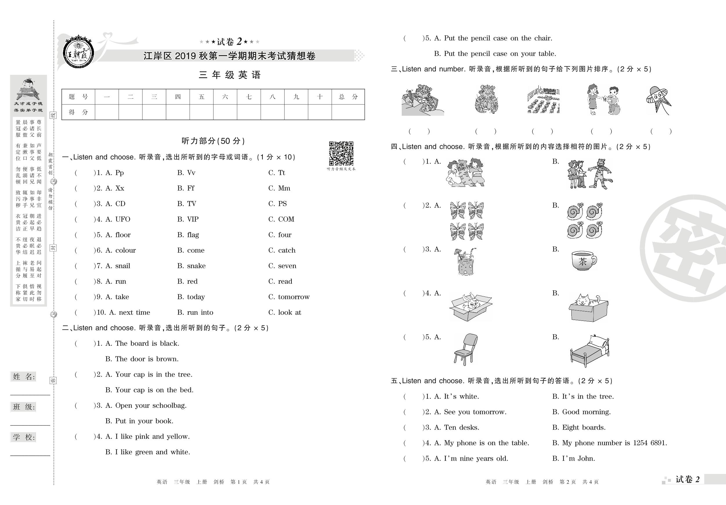 2018-2019学年第一学期武汉市江岸区三年级英语试卷(剑桥版)【2】