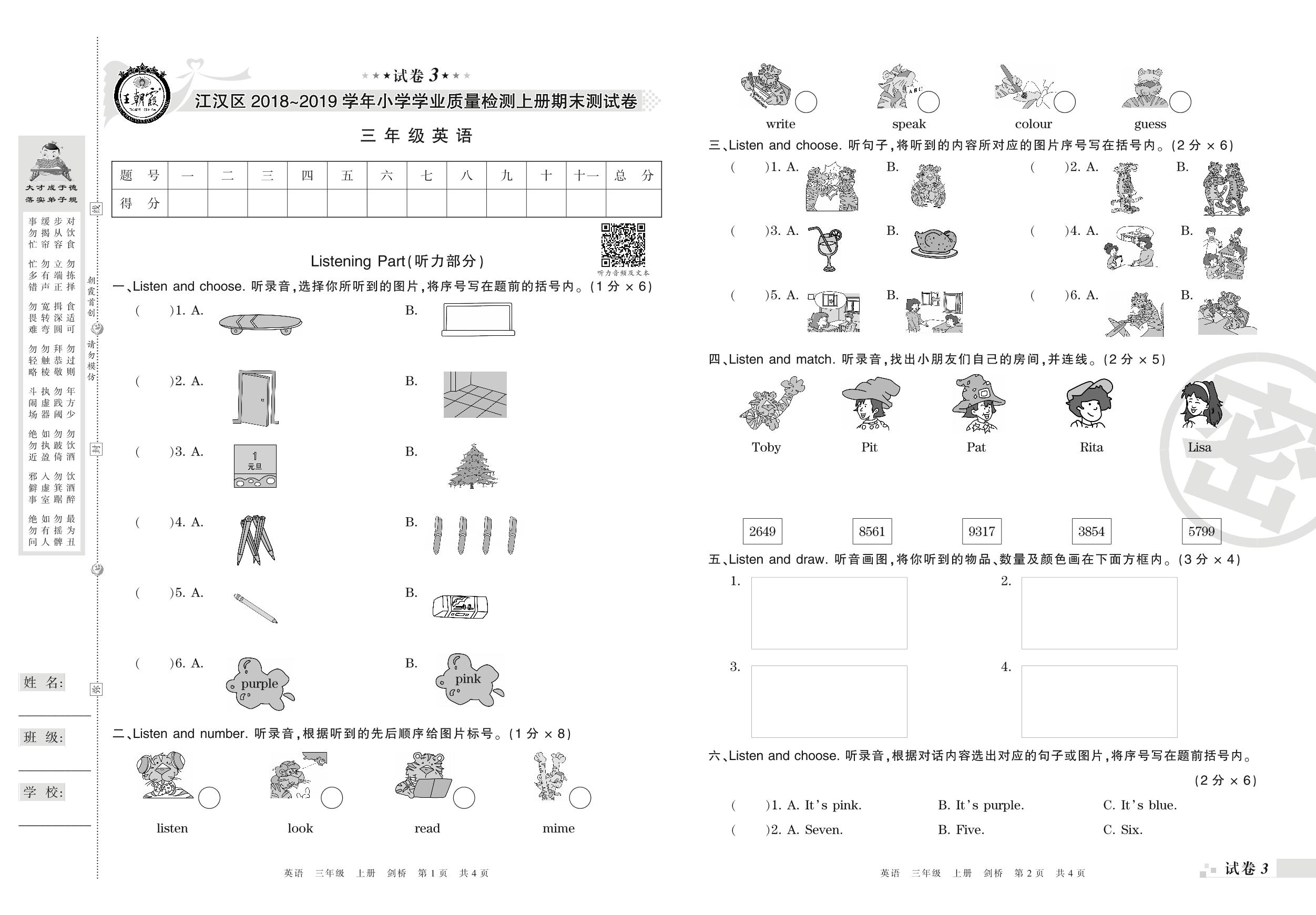 2018-2019学年第一学期武汉市江汉区三年级英语试卷(剑桥版)【3】