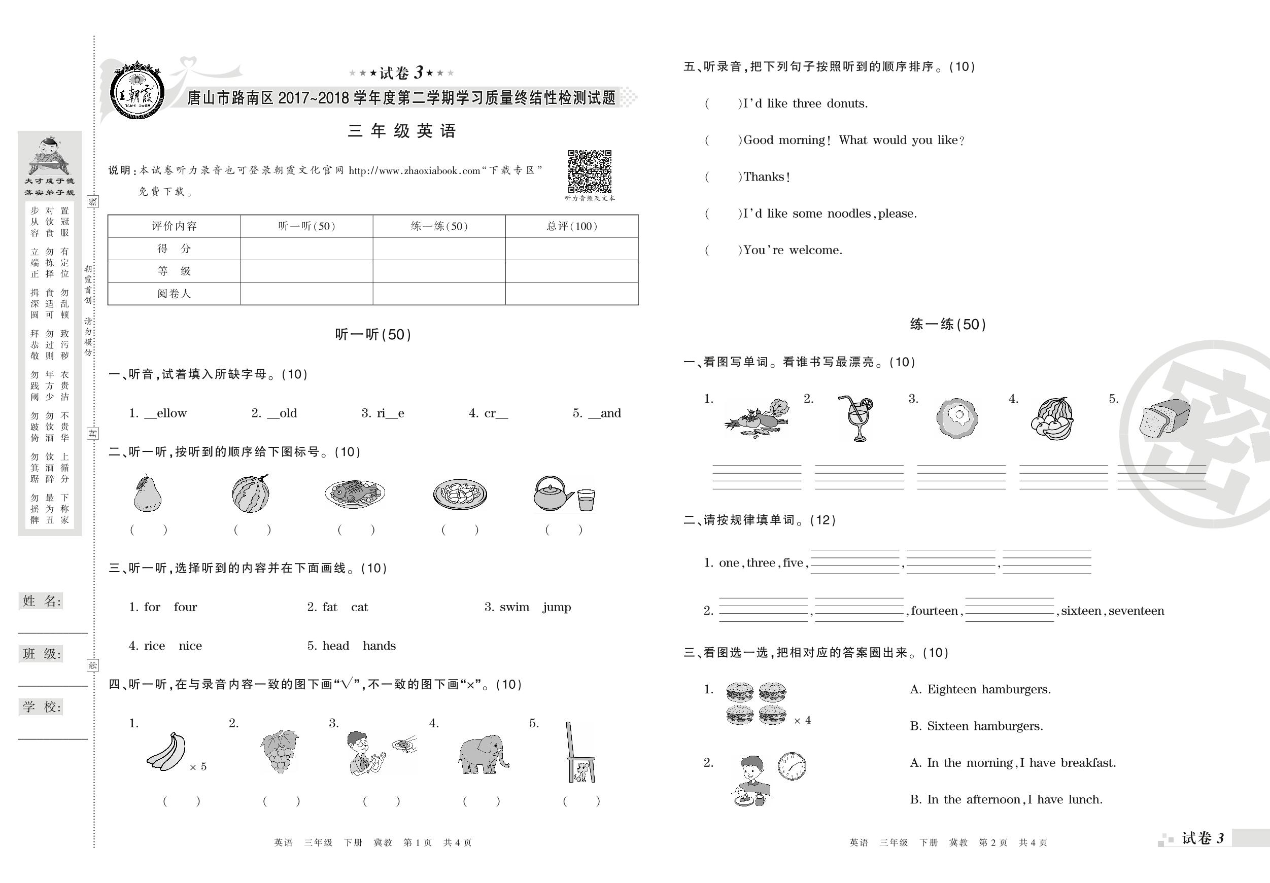 2017-2018学年第二学期唐山市路南区三年级英语试卷(冀教版)【3】