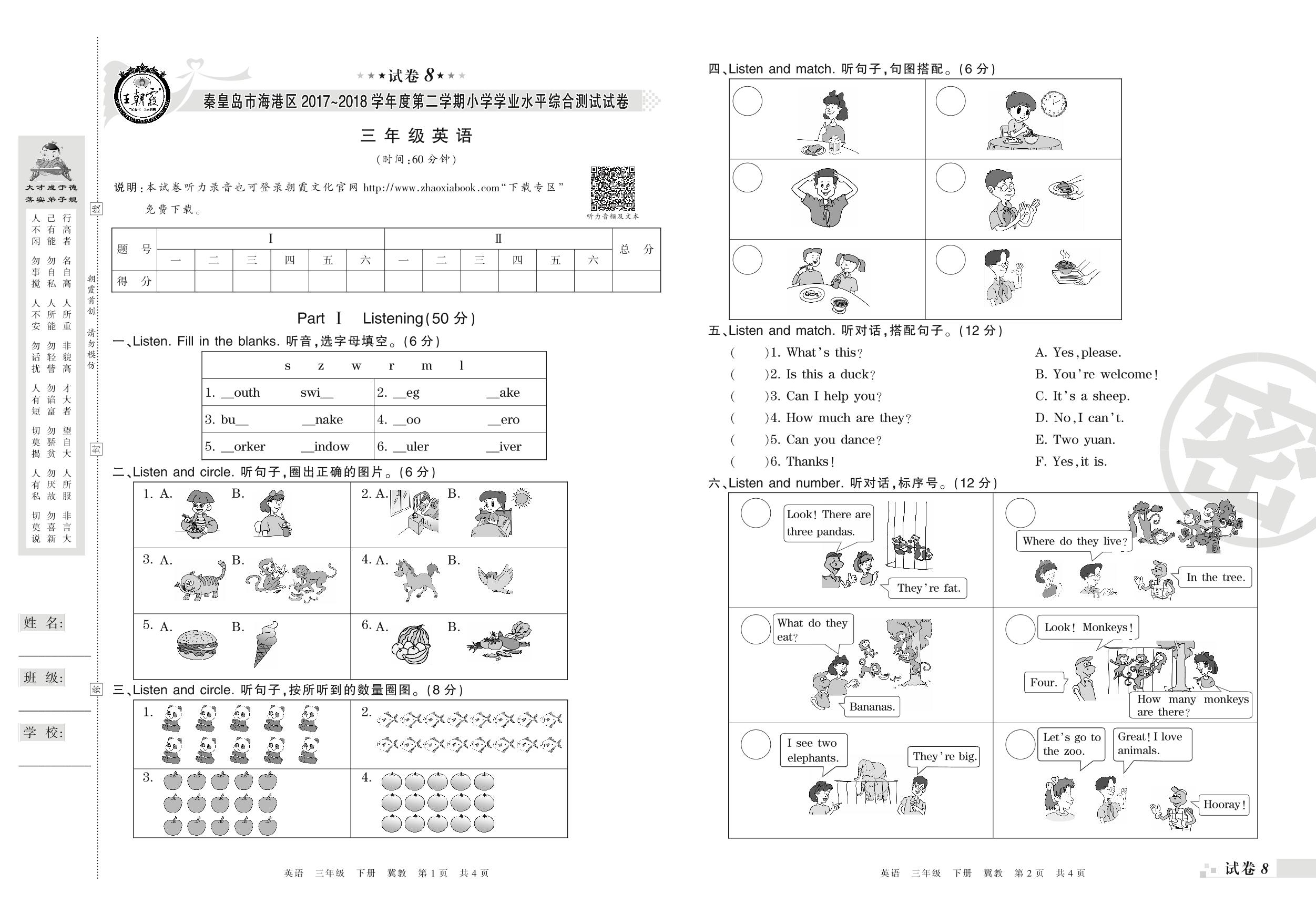2017-2018学年第二学期秦皇岛市海港区三年级英语试卷(冀教版)【8】