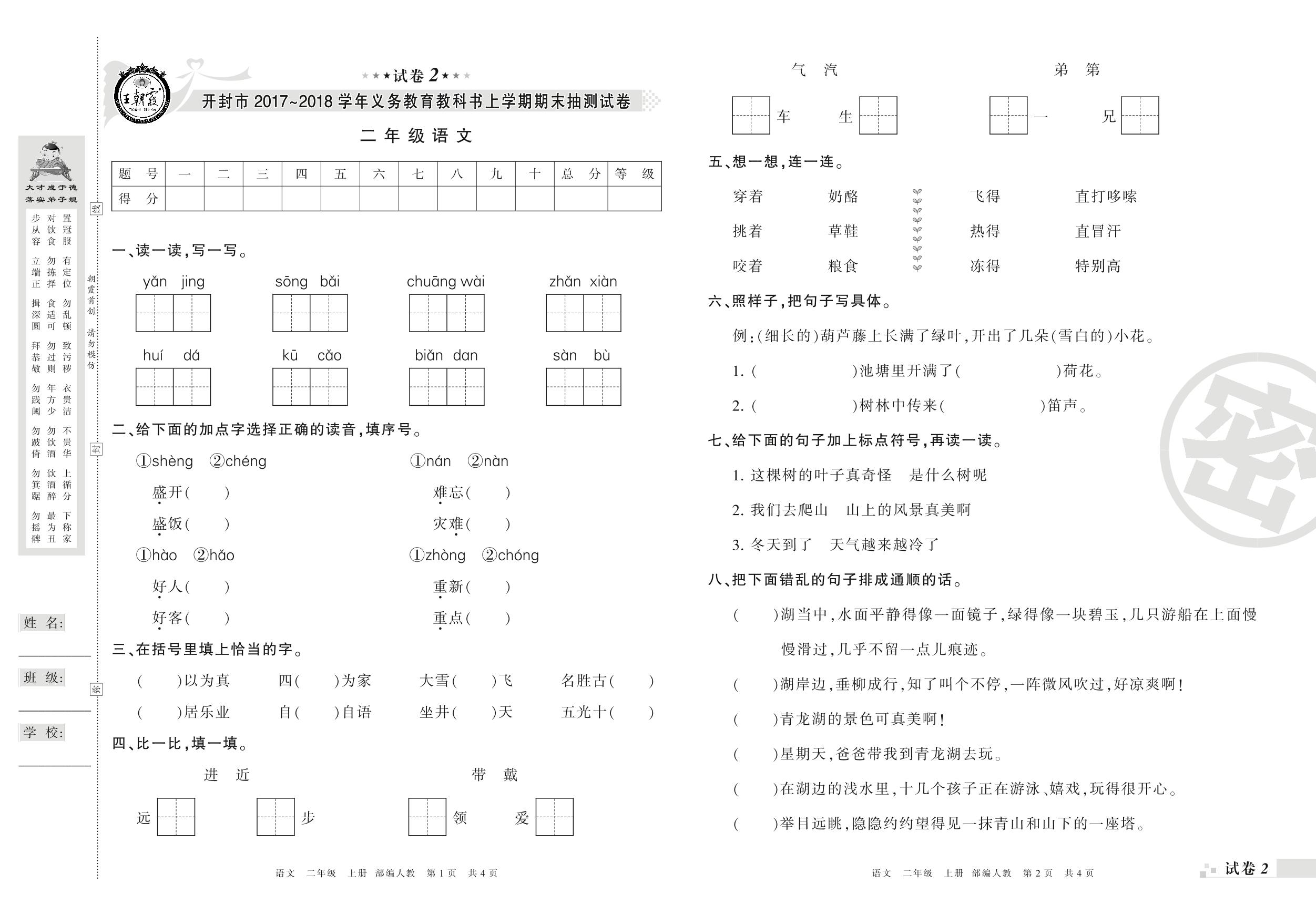 2017-2018学年第一学期开封市二年级语文试卷(人教版)【2】