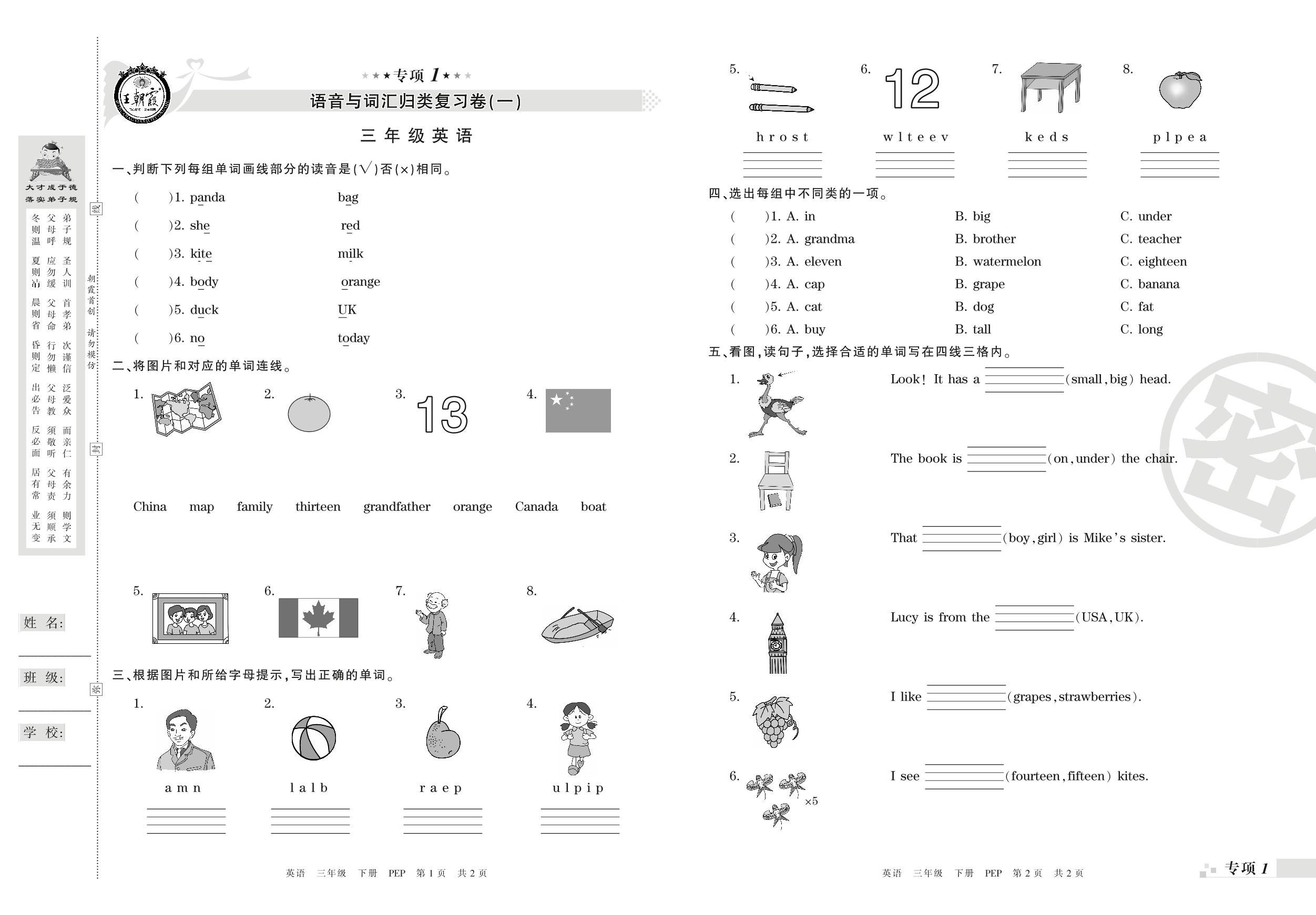 王朝霞期末专项卷——语音与词汇(一)(二)真题归类复习卷三年级下册英语(PEP版)_R210806191332【0】