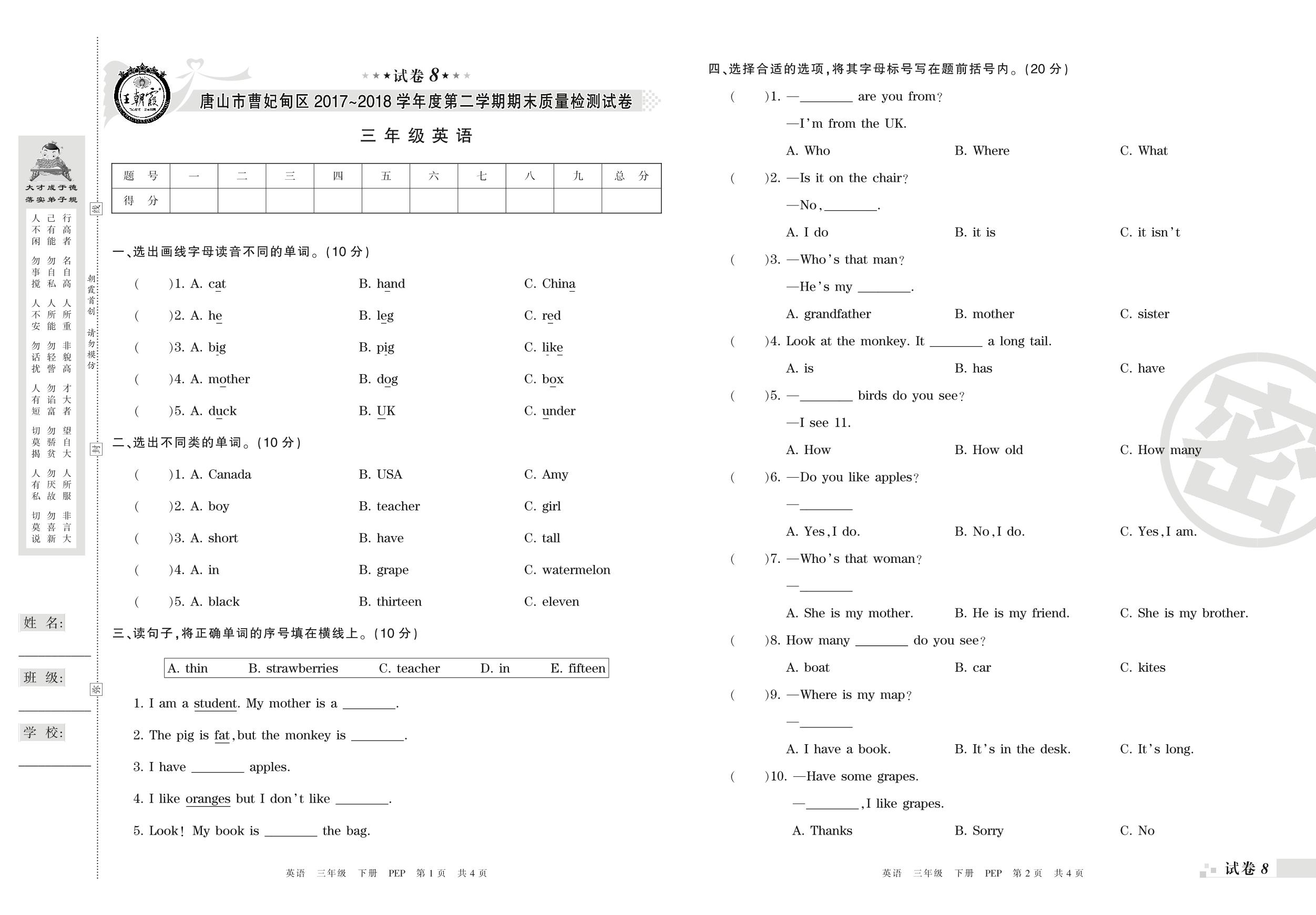 2017-2018学年第二学期唐山市曹妃甸区三年级英语试卷(PEP版)【8】