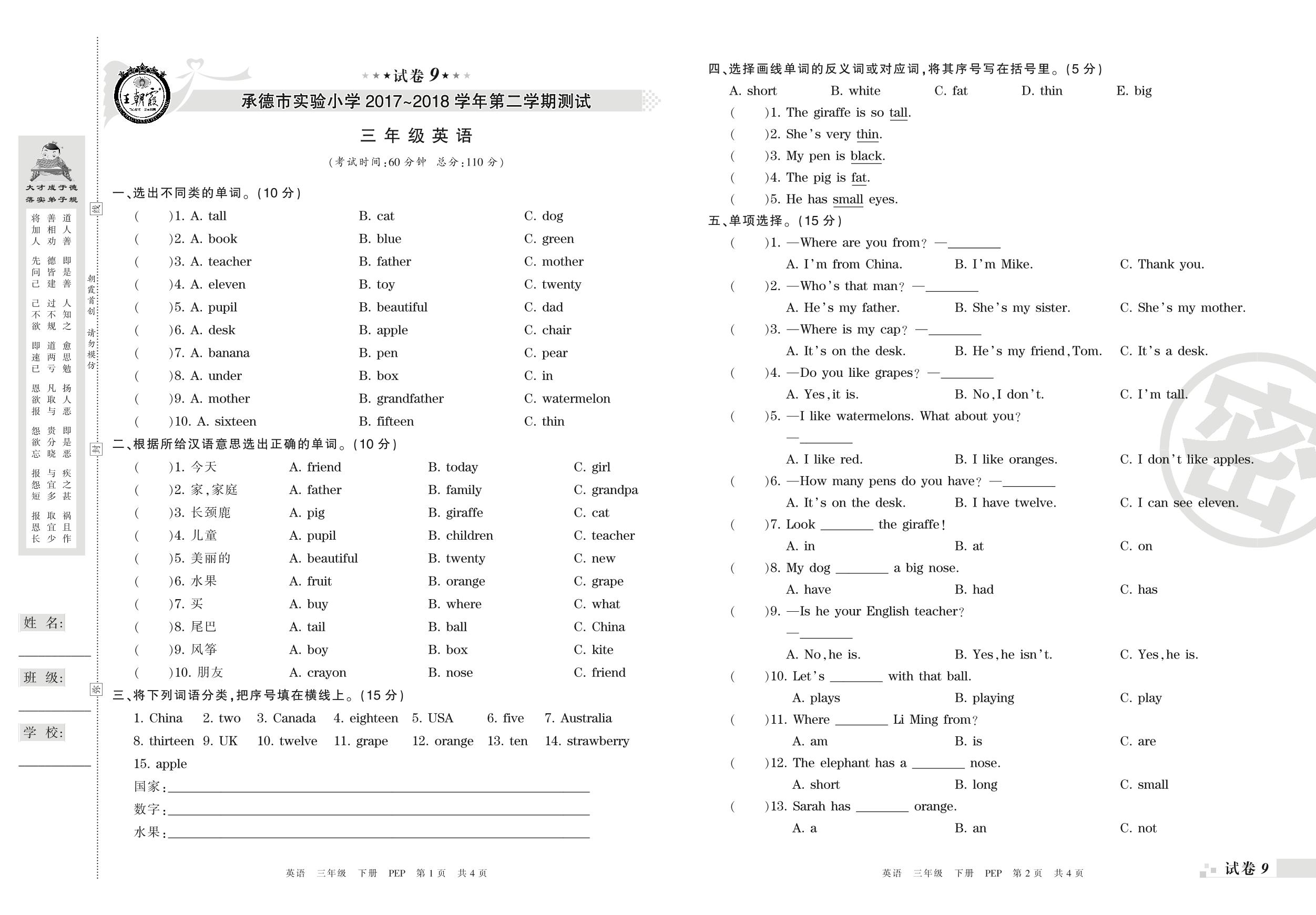 2017-2018学年第二学期承德市实验小学三年级英语试卷(PEP版)【9】
