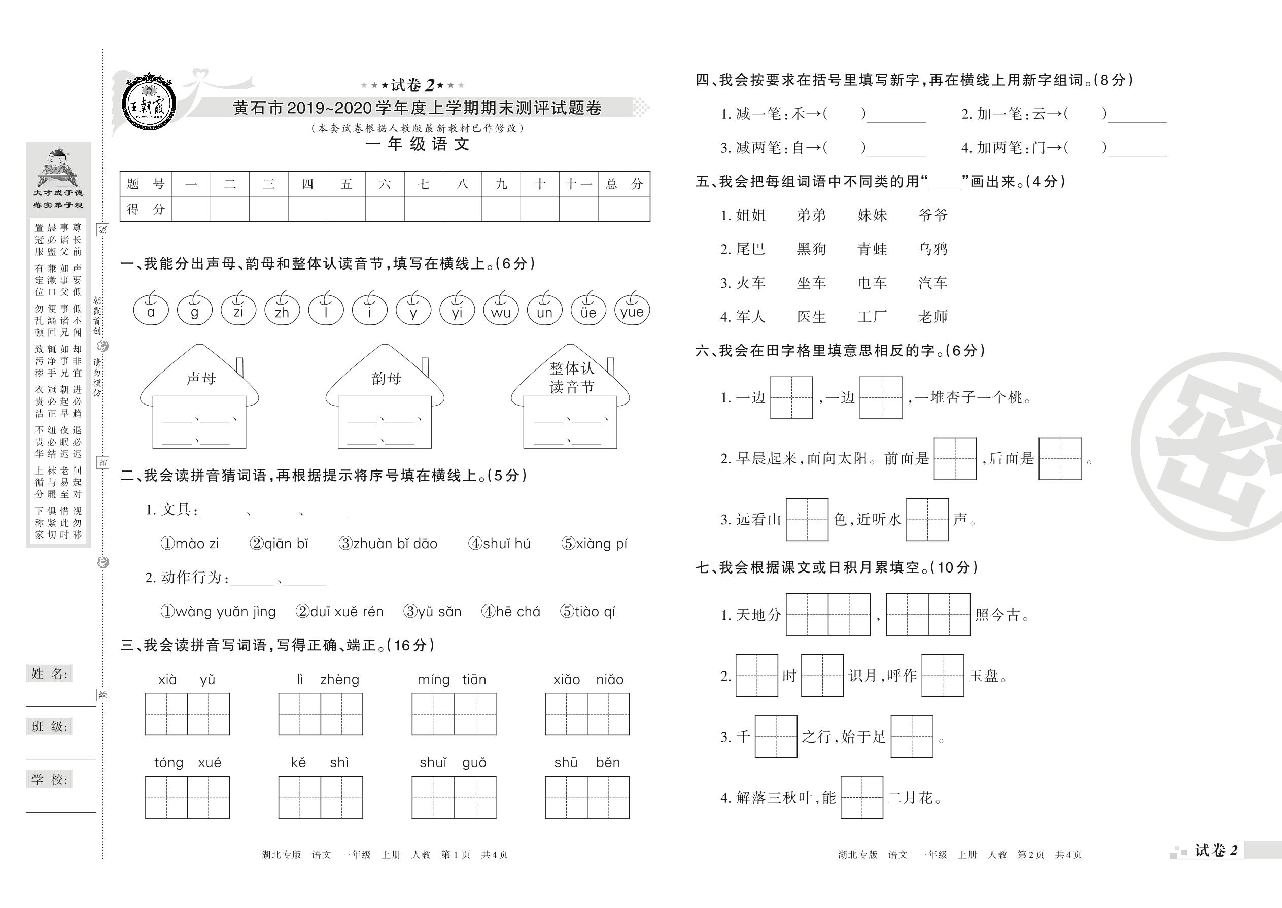 2019-2020学年第一学期黄石市一年级语文试卷(人教版)【2】