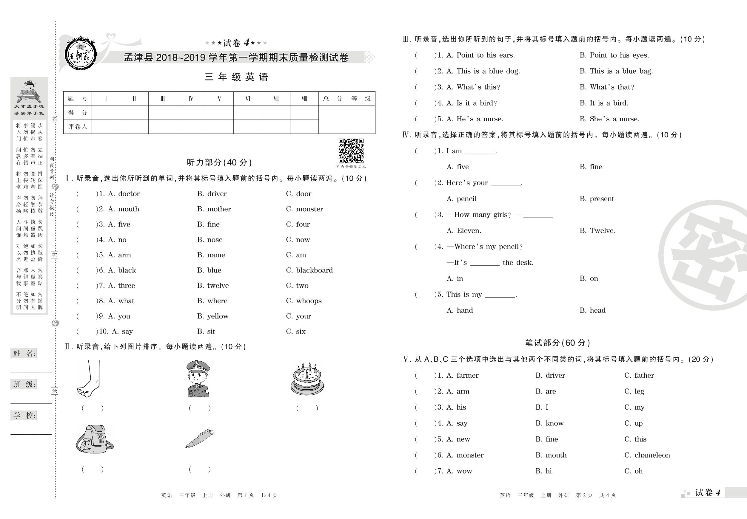 2018-2019学年第一学期洛阳市孟津县三年级英语试卷(外研版)【4】