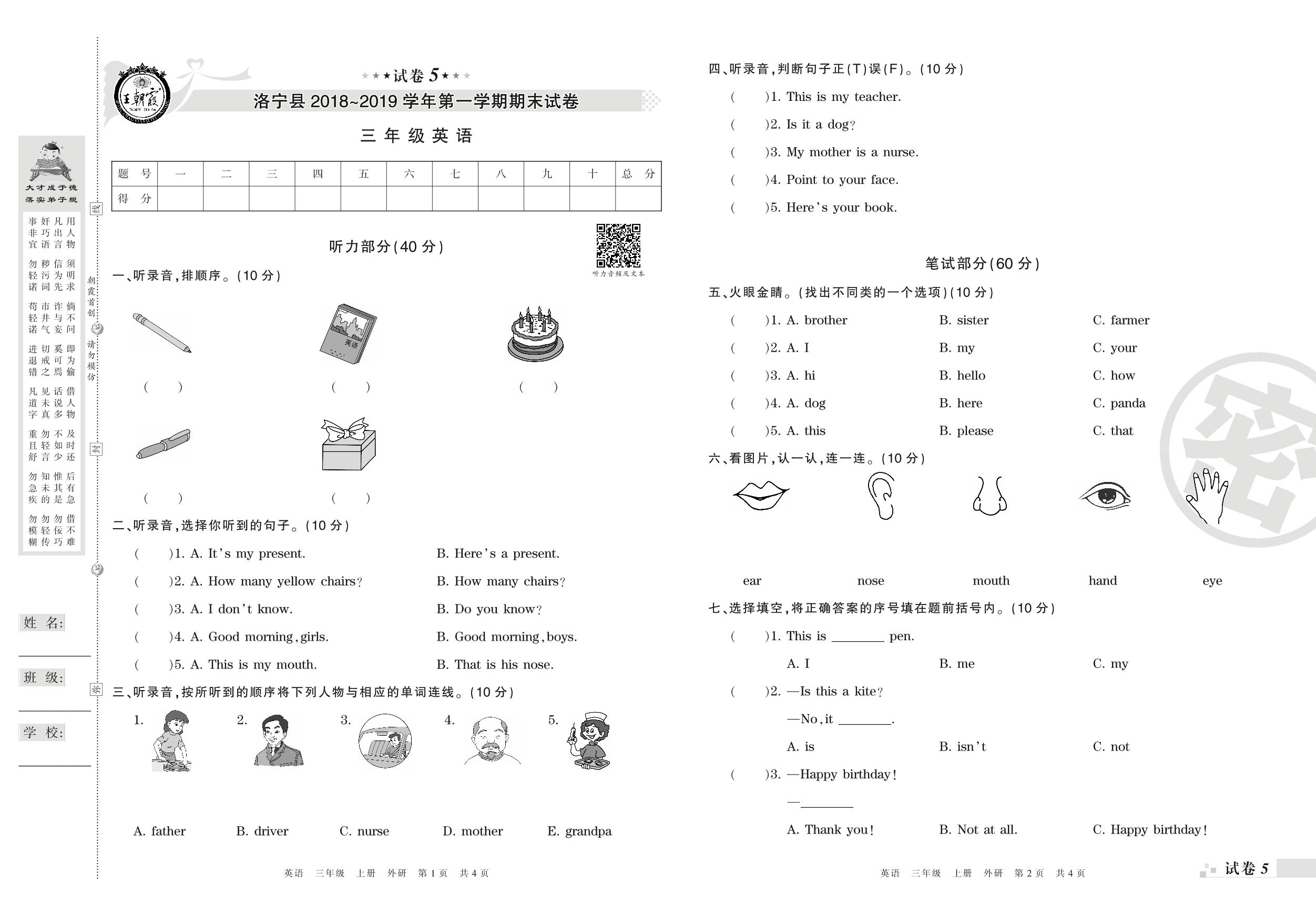 2018-2019学年第一学期洛阳市洛宁县三年级英语试卷(外研版)【5】