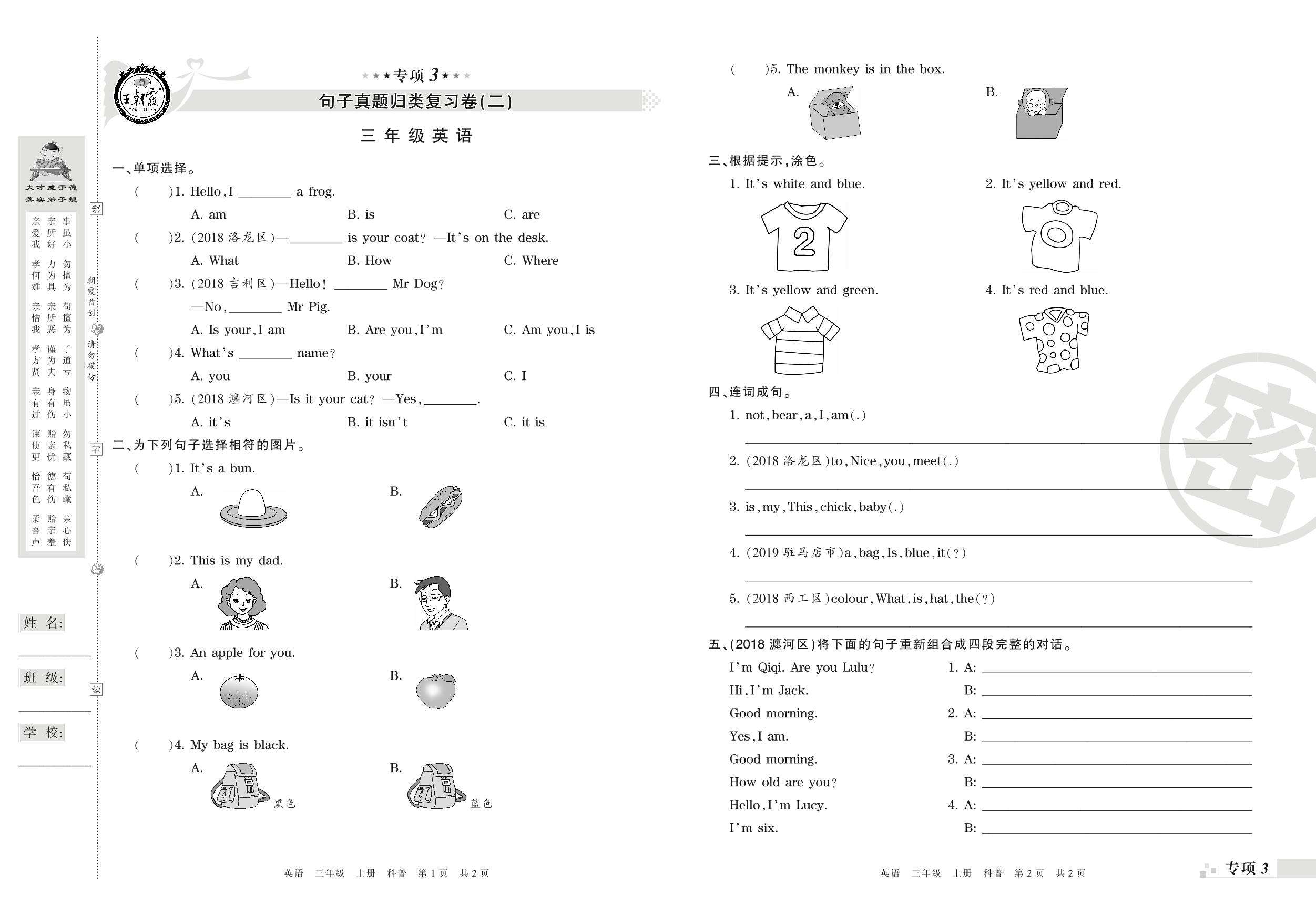 三年级英语科普版上册专项卷