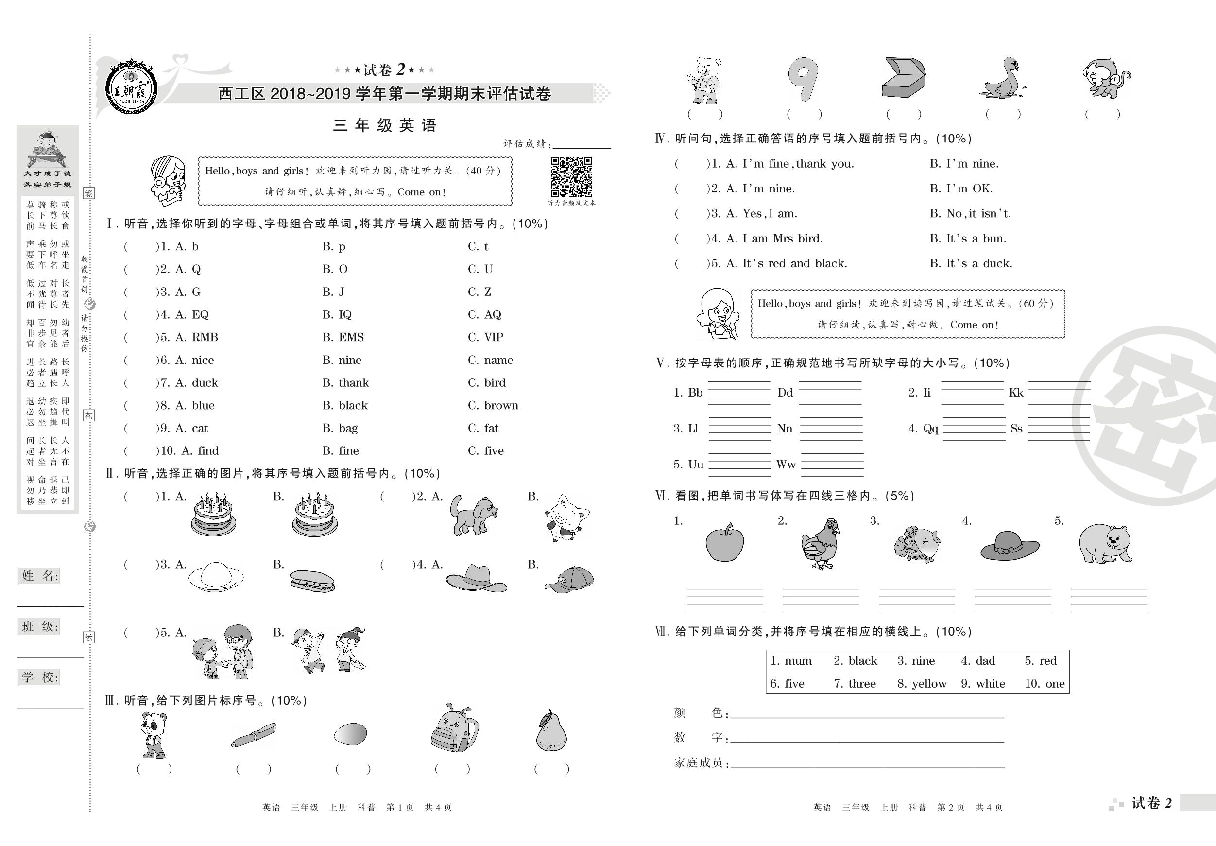 2018-2019学年第一学期洛阳市西工区三年级英语试卷(科普版)【2】