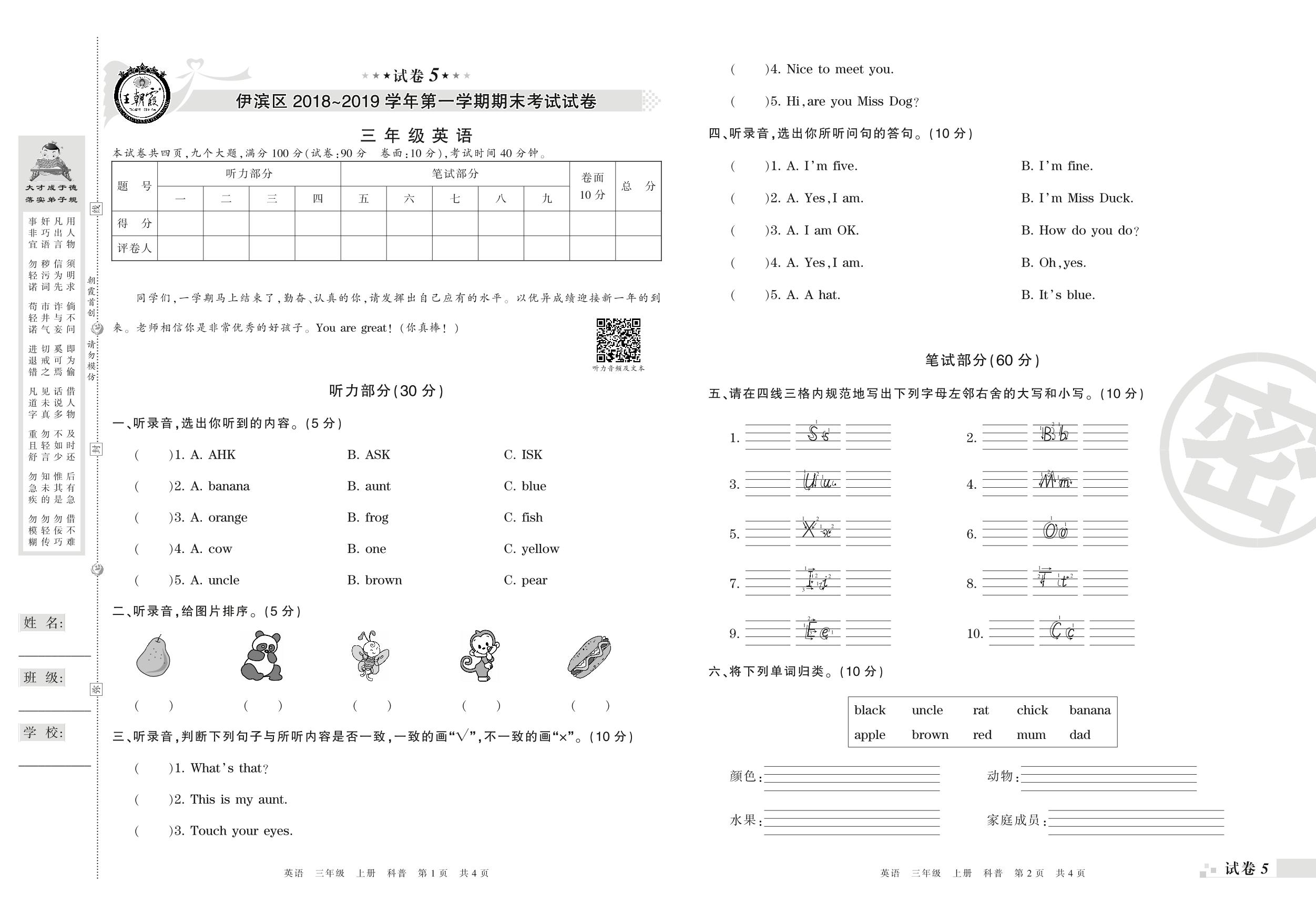2018-2019学年第一学期洛阳市伊滨区三年级英语试卷(科普版)【5】