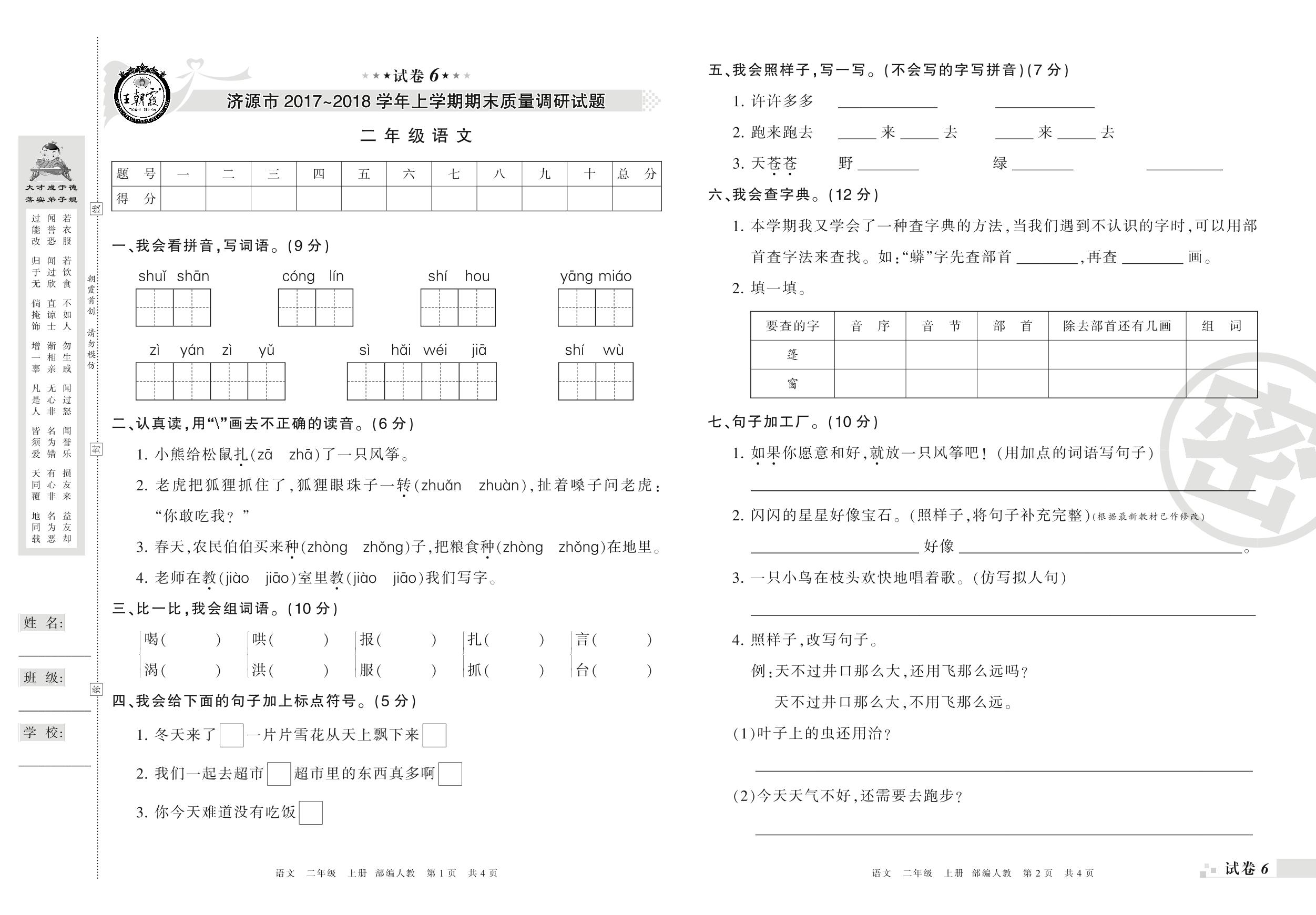 2017-2018学年第一学期济源市二年级语文试卷(人教版)【6】
