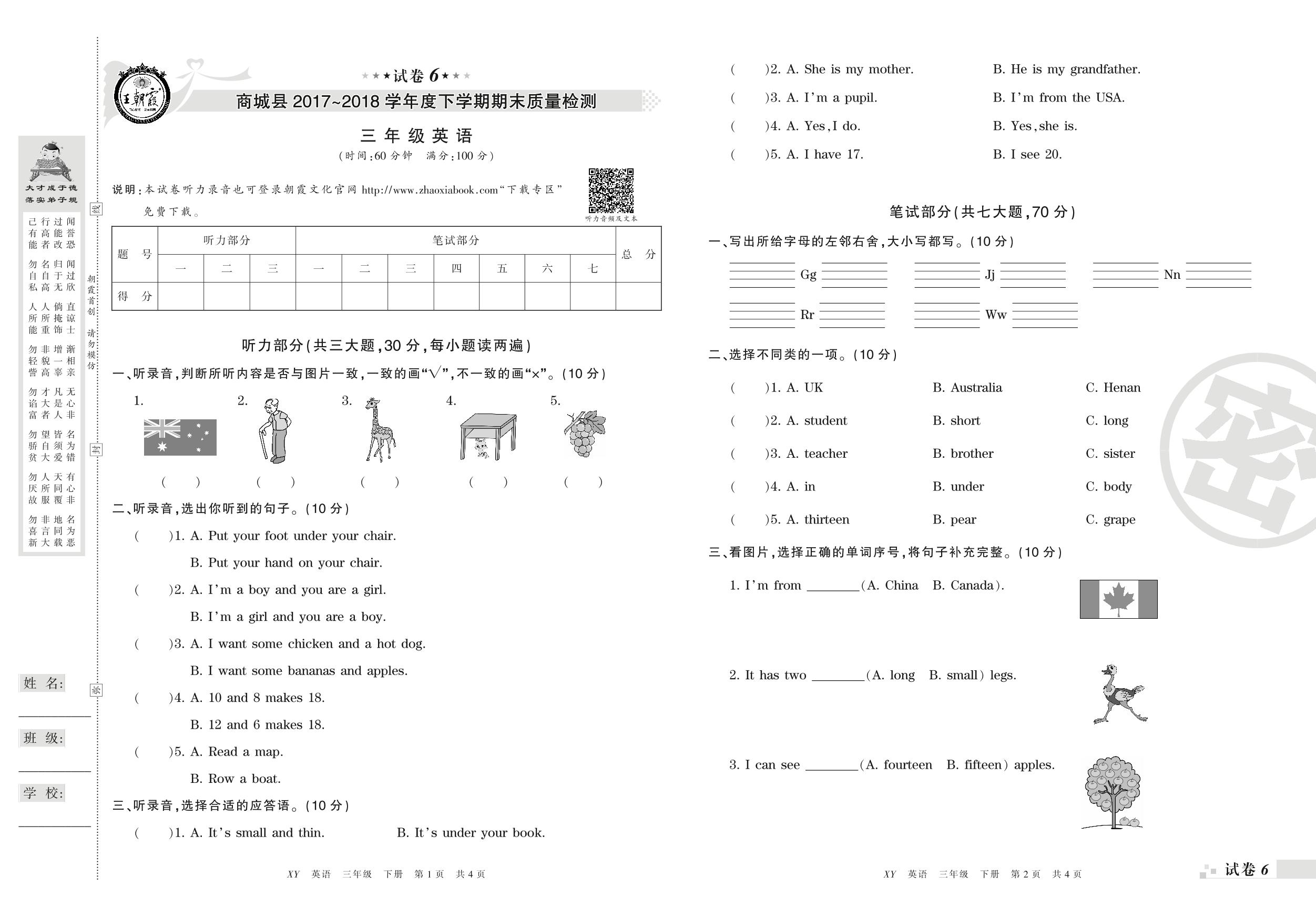 2017-2018学年第二学期信阳市商城县三年级英语试卷(PEP版)【6】