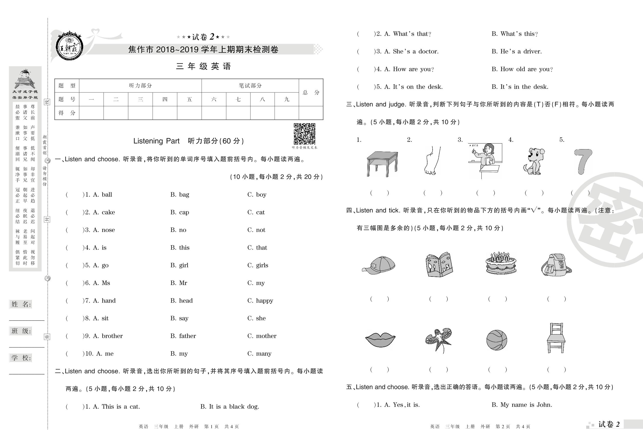 2018-2019学年第一学期焦作市三年级英语试卷(外研版)【2】