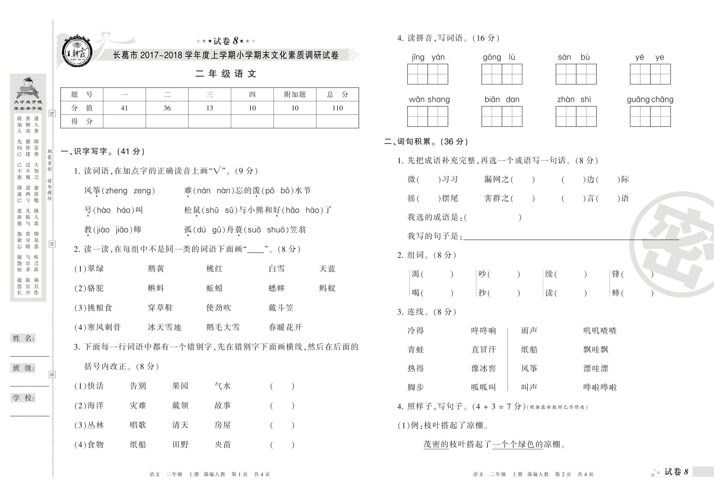 2017-2018学年第一学期长葛市二年级语文试卷(人教版)【8】