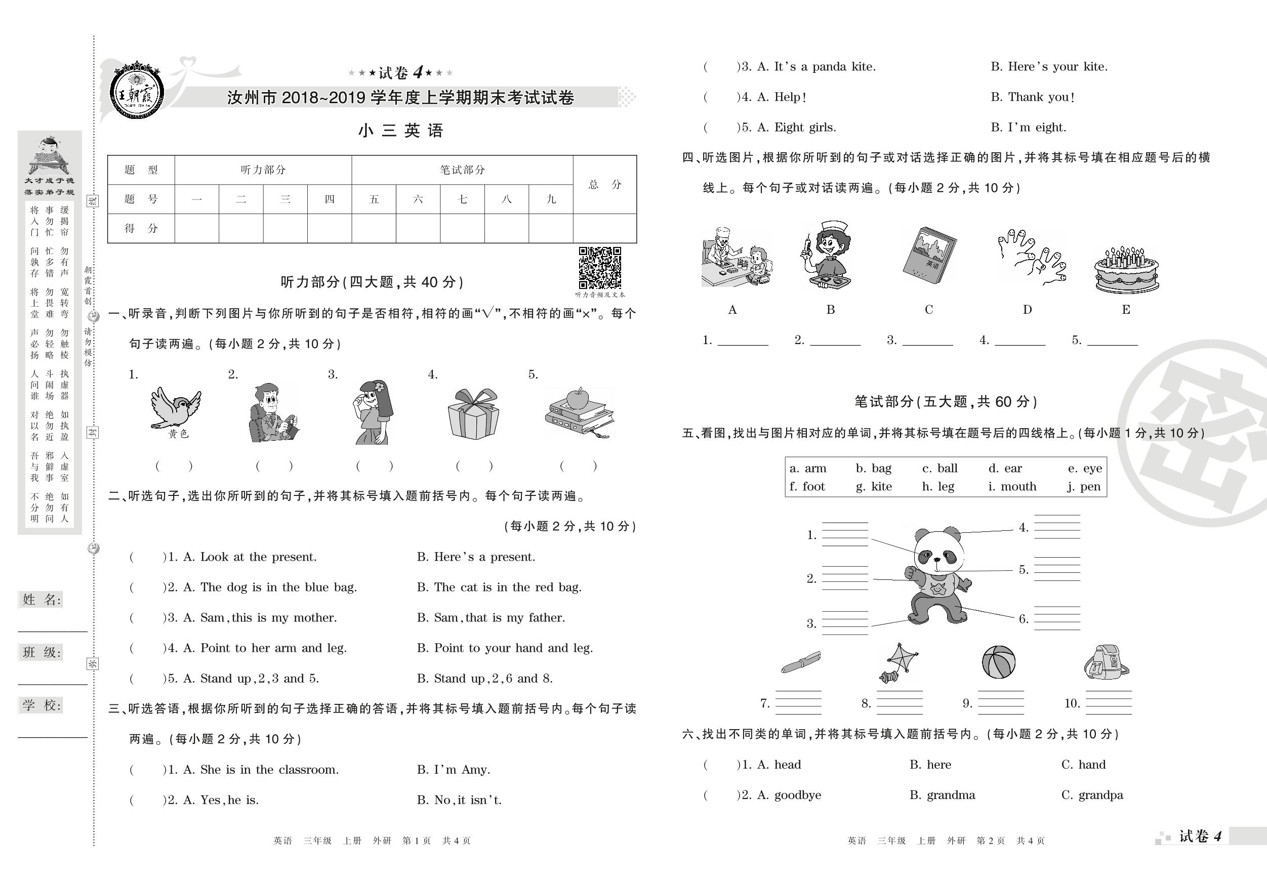 2018-2019学年第一学期汝州市三年级英语试卷(外研版)【4】