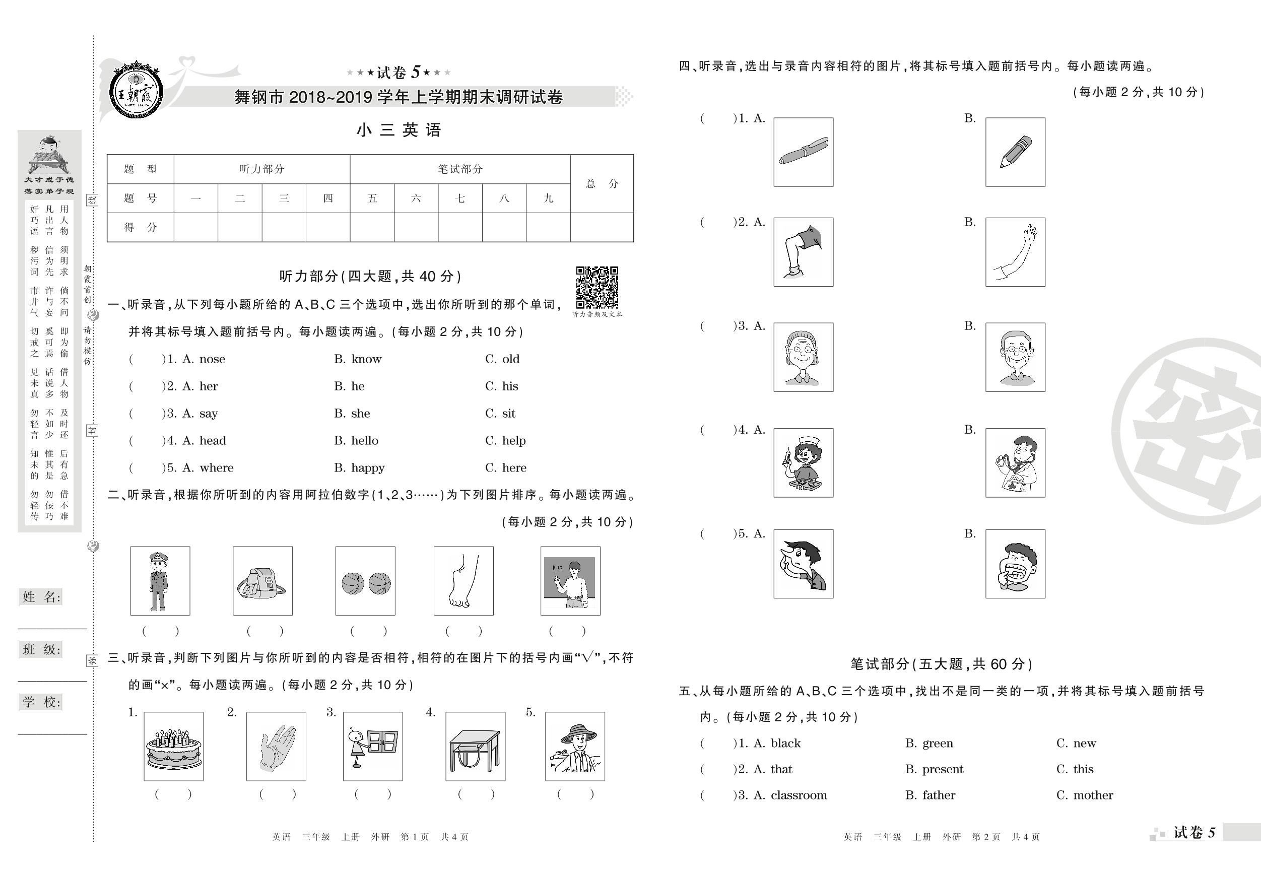 2018-2019学年第一学期舞钢市三年级英语试卷(外研版)【5】