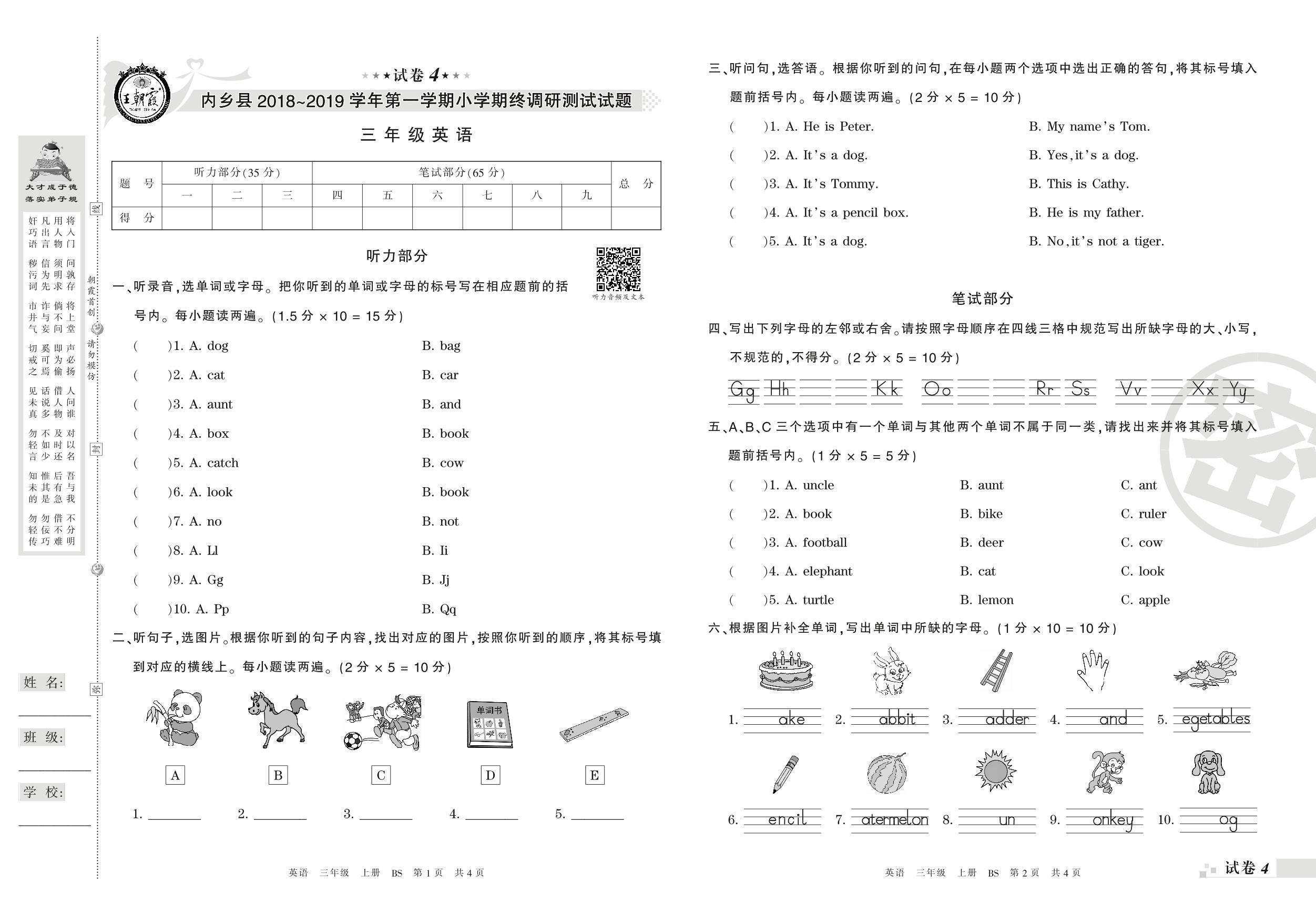 2018-2019学年第一学期南阳市内乡县三年级英语试卷(北师版)【4】