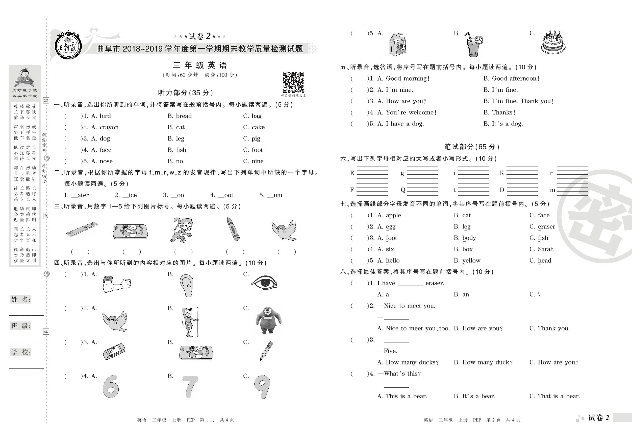 2018-2019学年第一学期曲阜市三年级英语试卷(PEP版)【2】