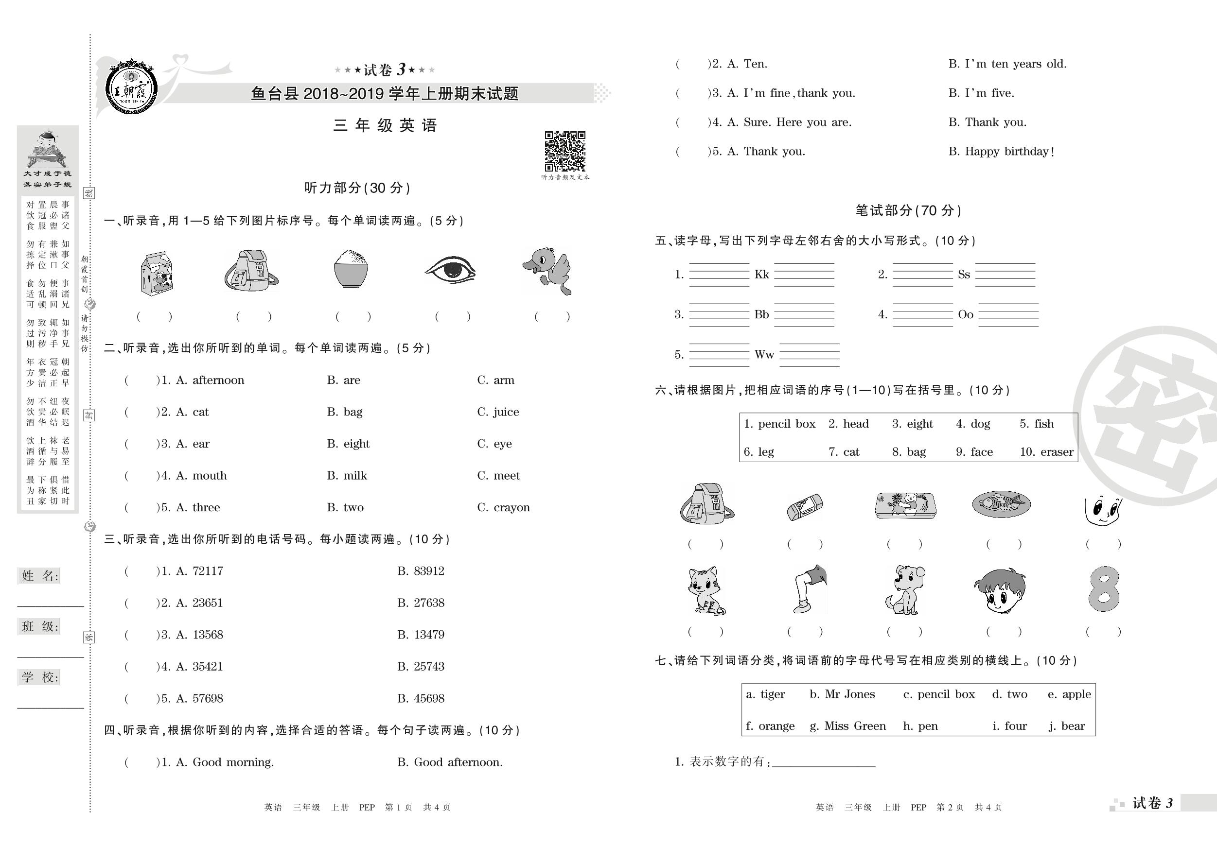 2018-2019学年第一学期济宁市鱼台县三年级英语试卷(PEP版)【3】