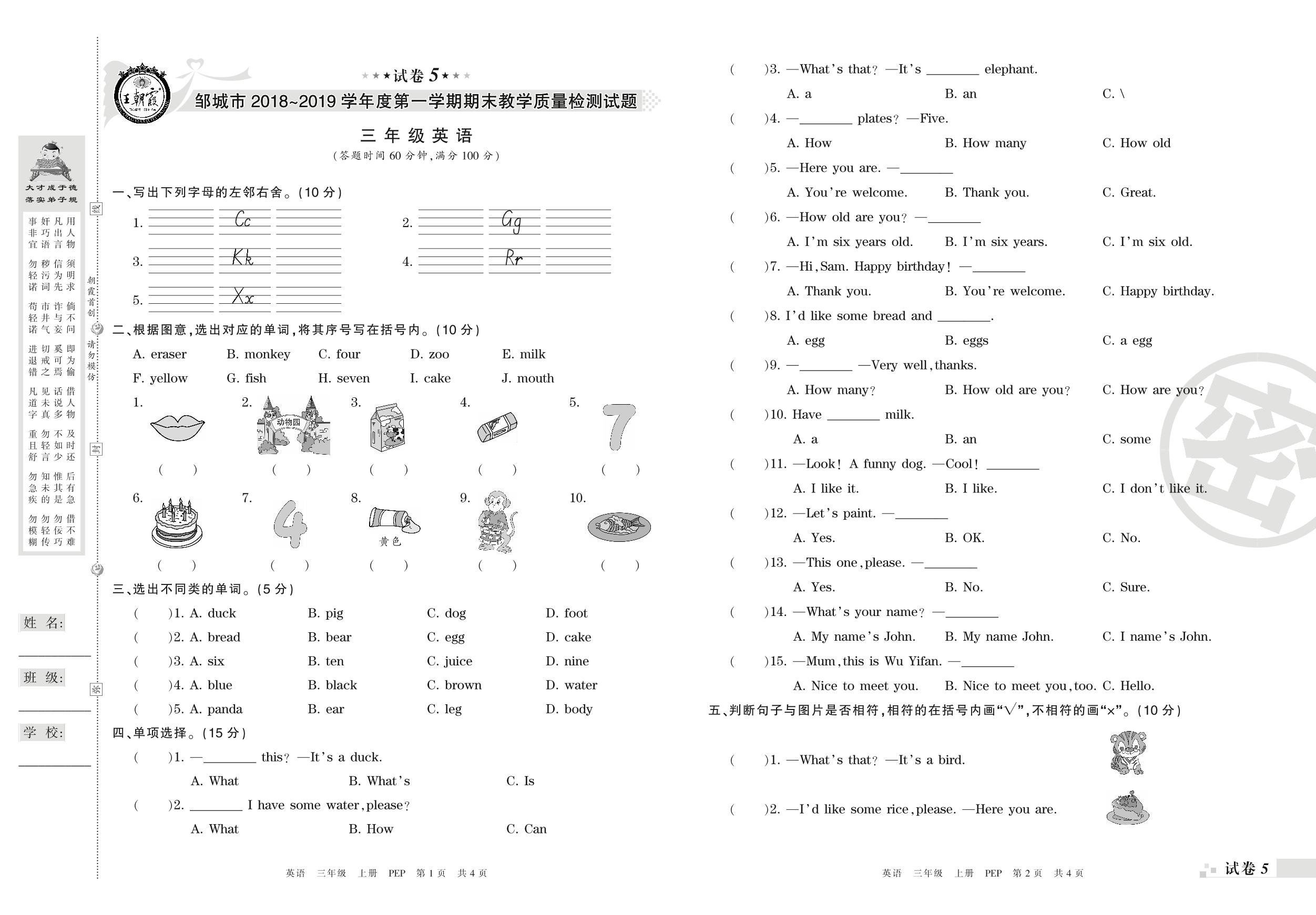 2018-2019学年第一学期邹城市三年级英语试卷(PEP版)【5】
