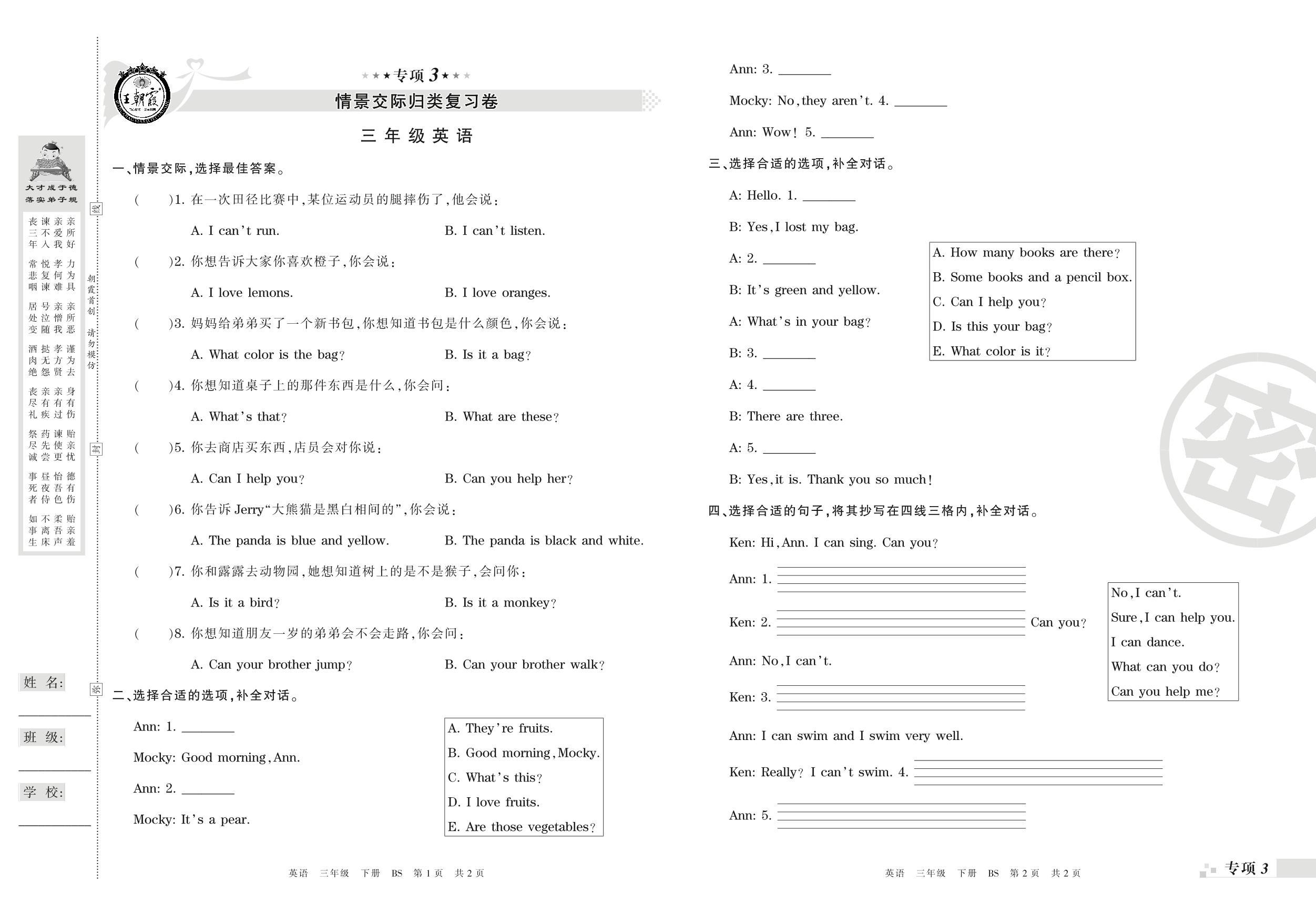 王朝霞期末专项卷——情景交际、阅读理解真题归类复习卷三年级下册英语(北师版)_R210806191831【0】
