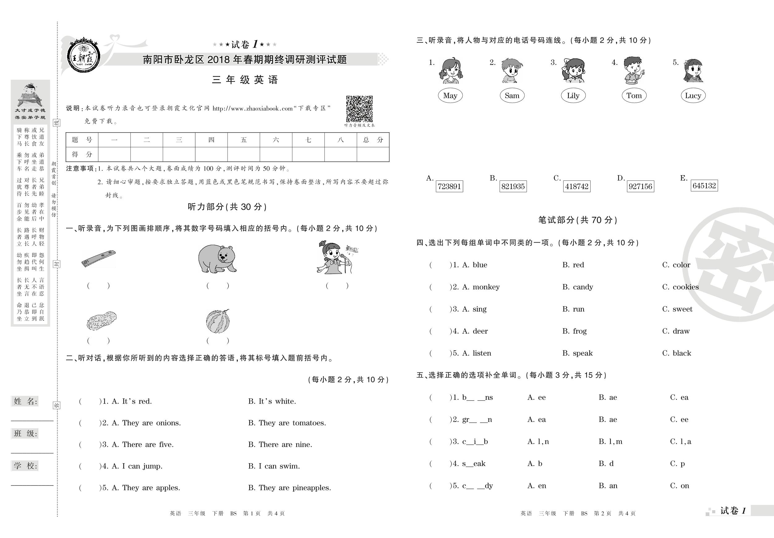 2017-2018学年第二学期南阳市卧龙区三年级英语试卷(北师版)【1】