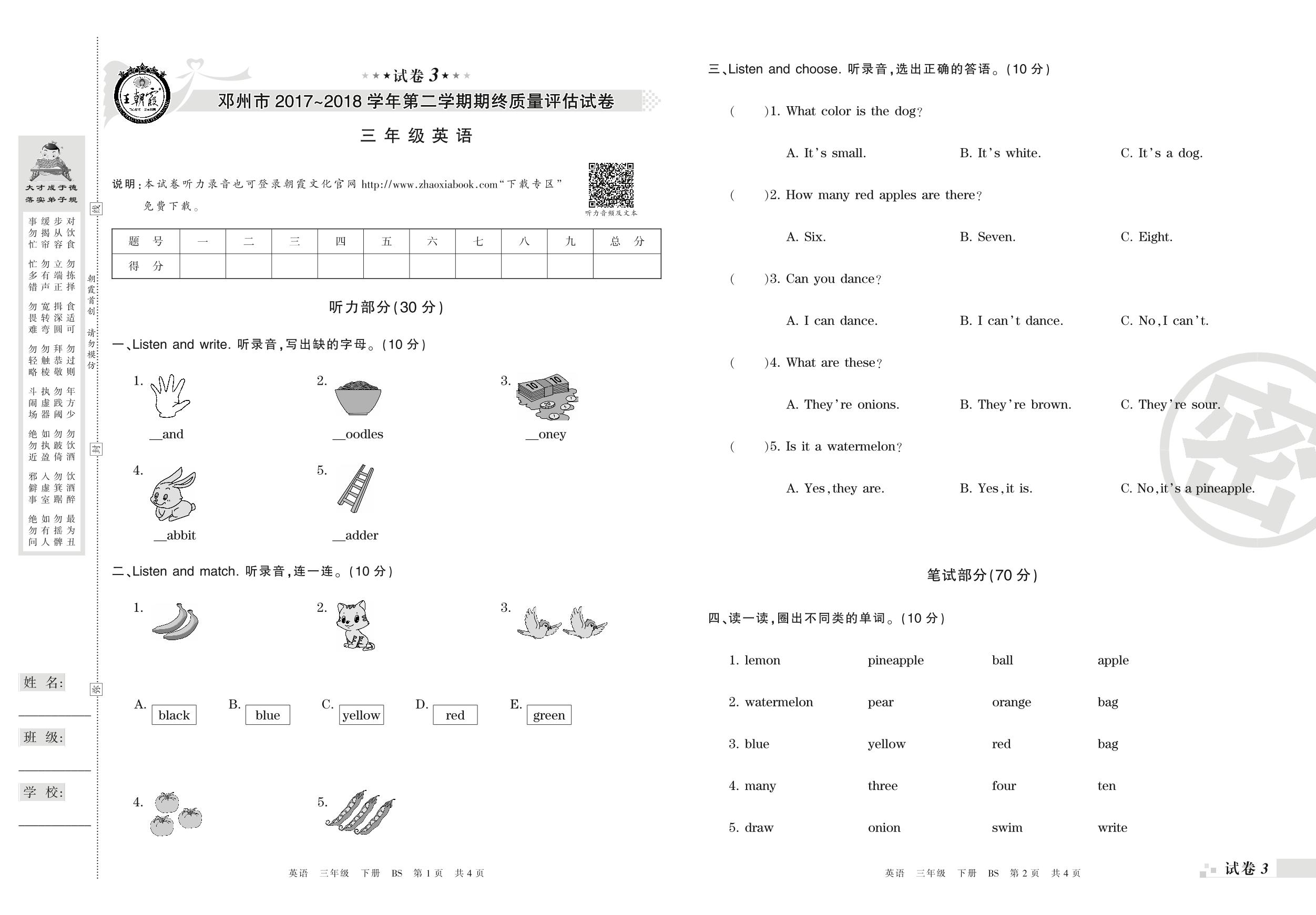 2017-2018学年第二学期邓州市三年级英语试卷(北师版)【3】