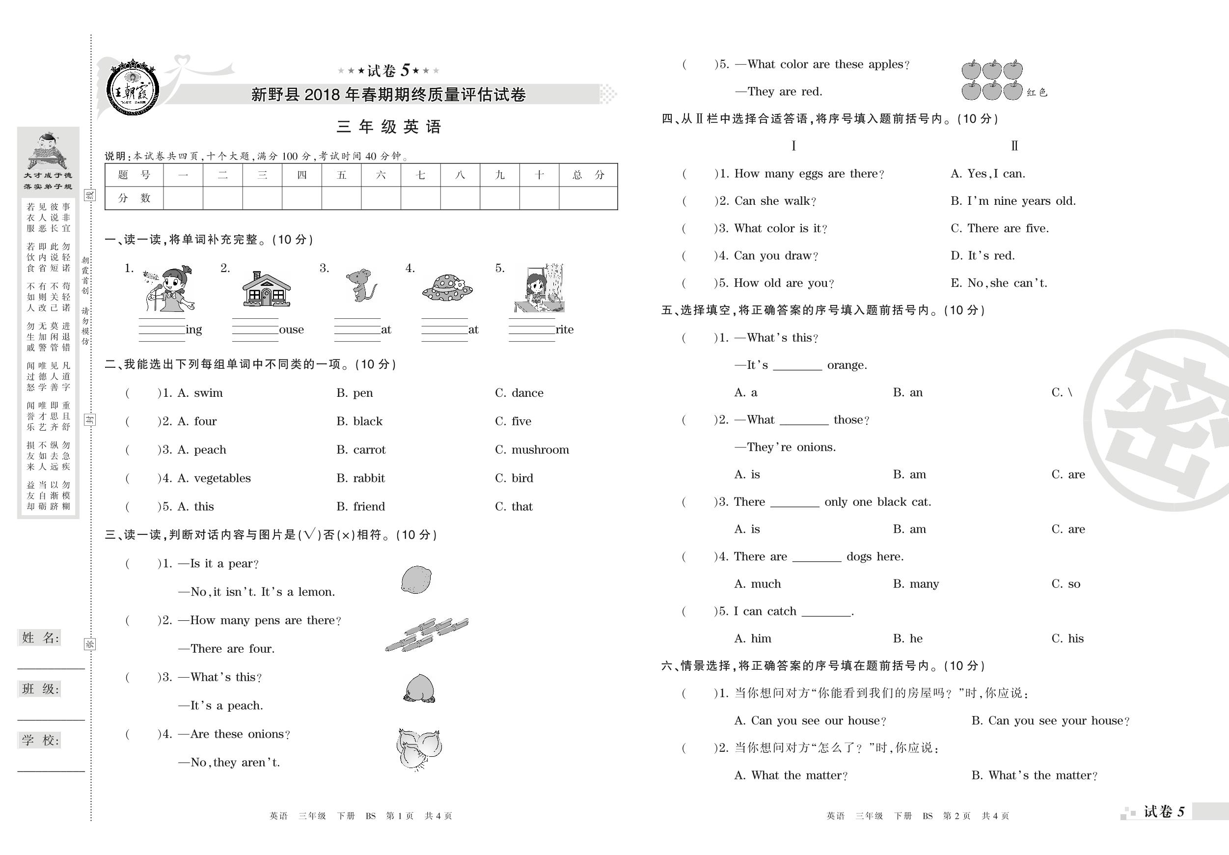 2017-2018学年第二学期南阳市新野县三年级英语试卷(北师版)【5】