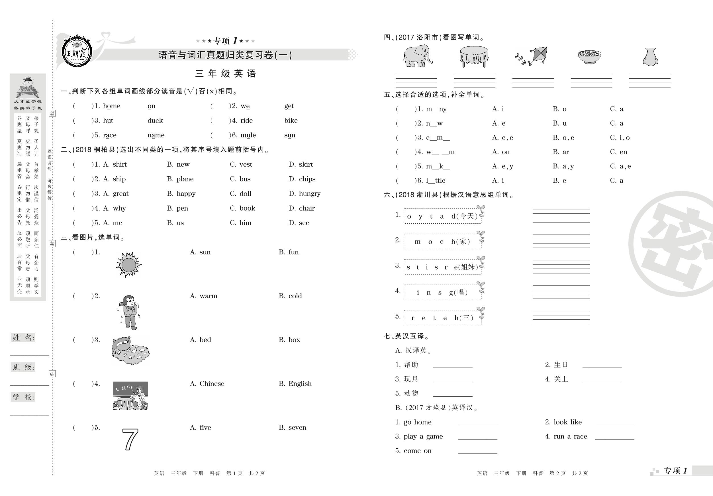 王朝霞期末专项卷——语音与词汇(一)(二)真题归类复习卷三年级下册英语(科普版)_R210806191954【0】